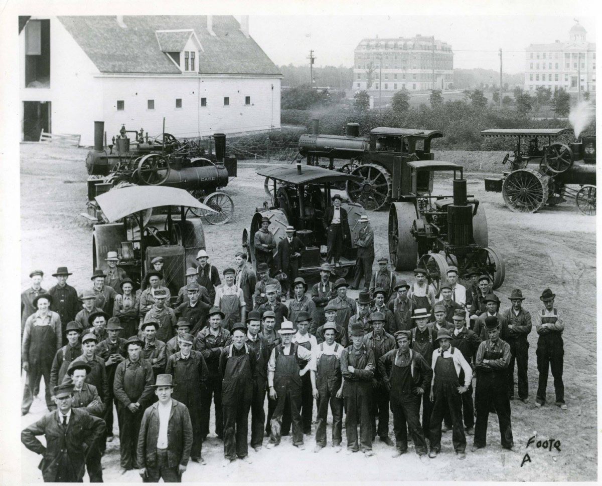 A photograph of the members of a short course in tractors offered by the Manitoba Agricultural College at its Tuxedo campus in 1907. This black-and-white photograph, taken by Lewis Foote, depicts the students arrayed in front of a collection of tractors. Source: Faculty of Agriculture fonds.
