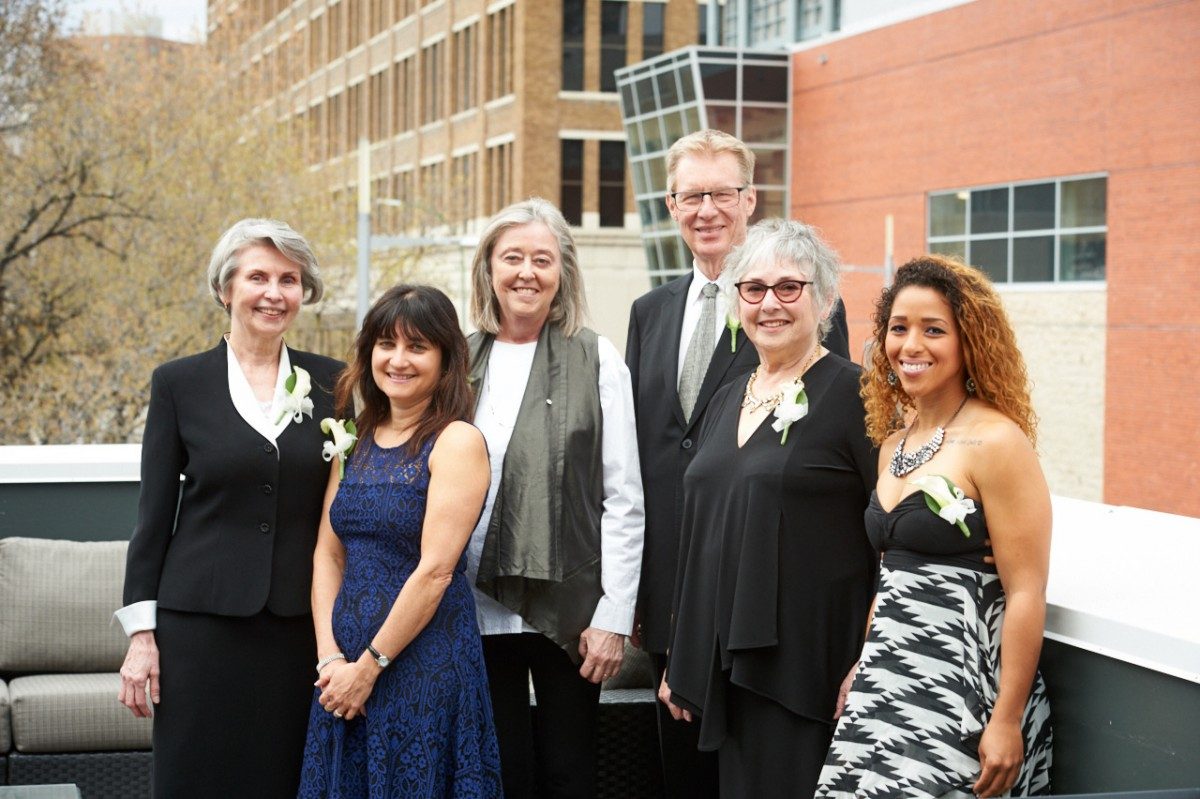 The 2017 Distinguished Alumni Award recipients: L-R, Sr. Lesley Sacouman [BA/75], Isabella Wiebe [BMR(OT)/86], Patricia Patkau, CM [BID/73], John Patkau, CM [BA/69, BES/69, MArch/72], Reva Stone [BA/68, BFA(Hons)/85] and Desiree Scott [BA/16]. // Photo by Ian McCausland