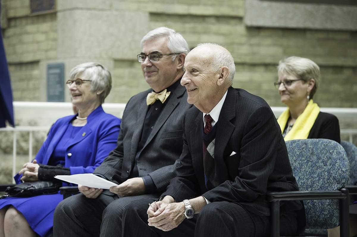 A treat for the audience then came when Ernest Rady came back to the podium to receive a replica senior stick staff from Robert Schmidt, senior stick for the Manitoba Medical Students’ Association as a tribute to his generosity.