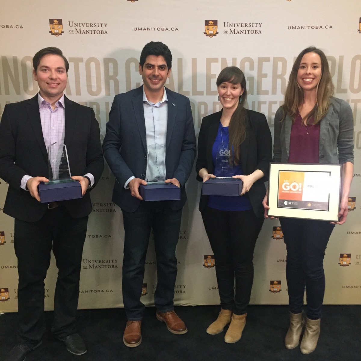 Jill Bueddefeld (far right) was awarded the People's Choice Award at the 3MT Finals Wednesday, March 21 at the University of Manitoba. // photo via @umanitoba on Twitter