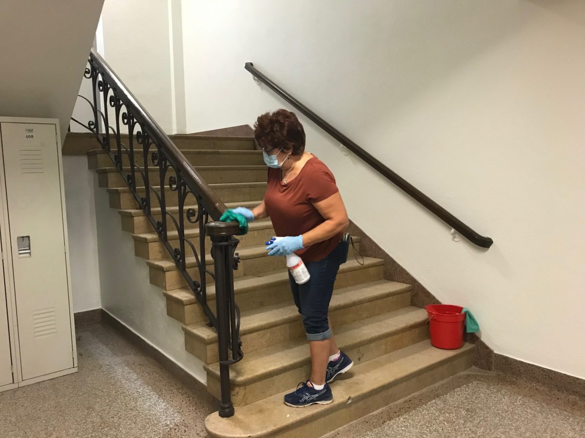 Caretaking staff is busy cleaning and sanitizing our campuses under new safety protocols.