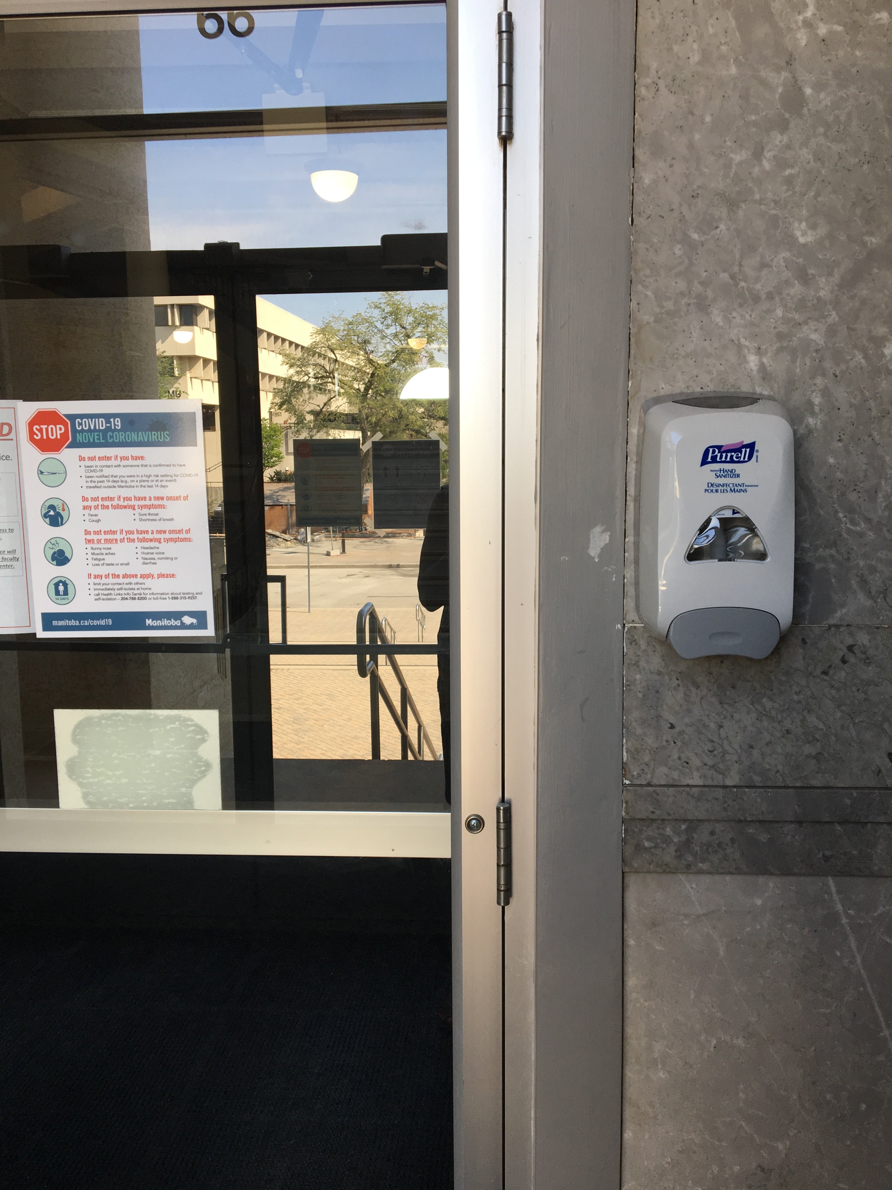 Hand sanitizer dispensers have been installed in each of the buildings, near the main entrances/exits doors, by main floor elevators, and in tunnel entrances/exits and stairwells.