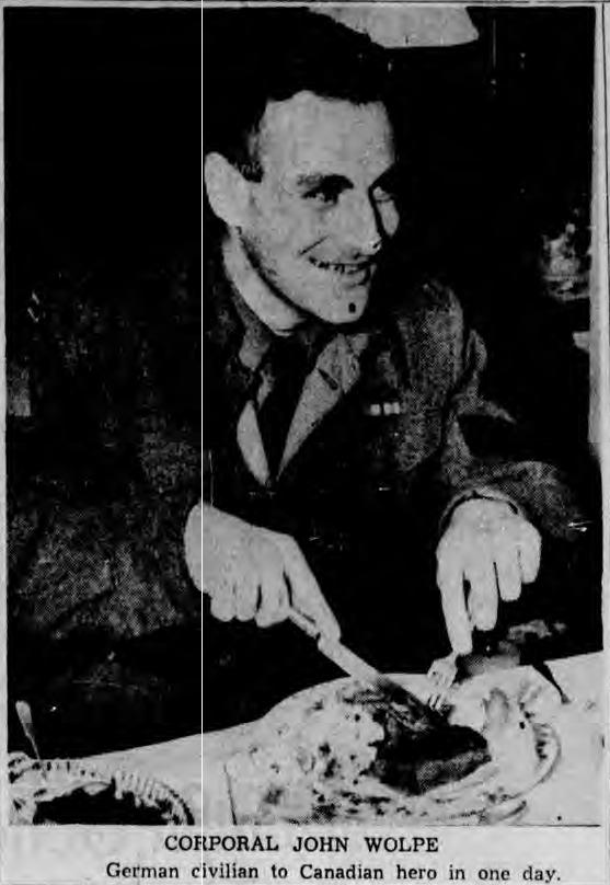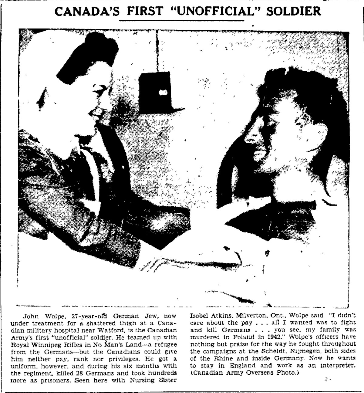 After joining up with the Winnipeg Rifles, he adopted the name “John” to sound less German. “John” Wolpe rapidly gained the respect of his fellow soldiers and his officers had only praise for him. He fought with the regiment for six months as it made its way through France, Belgium and the Netherlands, where he was wounded in the leg by machine gun fire at Deventer.