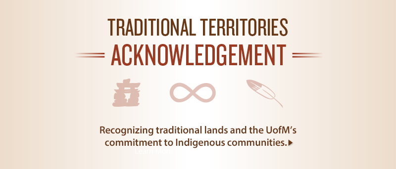 The University of Manitoba campuses are located on original lands of Anishinaabeg, Cree, Oji-Cree, Dakota, and Dene peoples, and on the homeland of the Métis Nation.