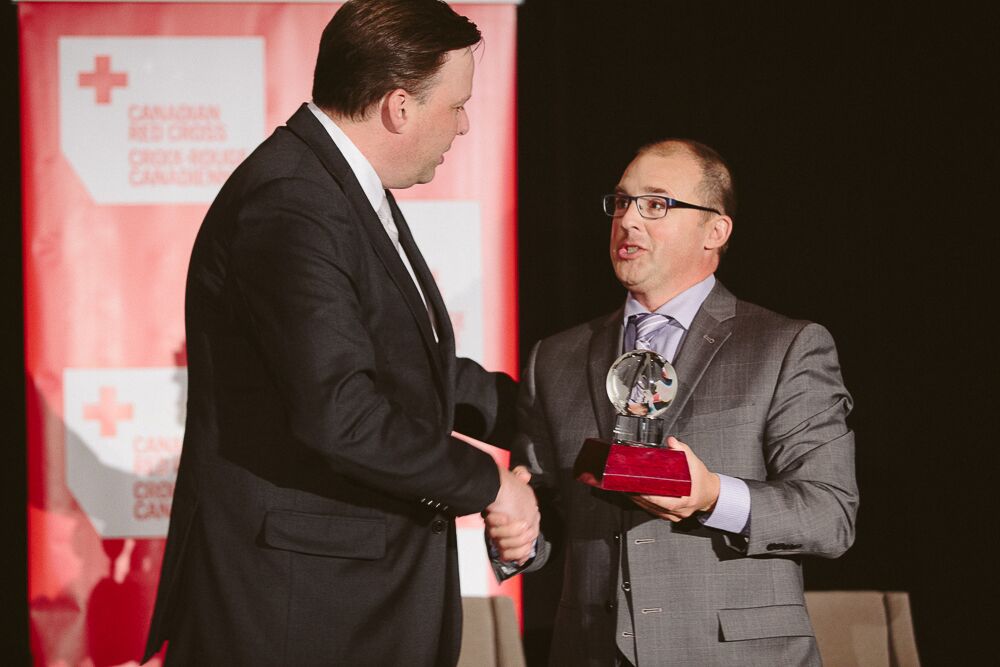 John MacAulay (left) receiving award from Shawn Feely, Provincial Director at the Canadian Red Cross Manitoba (right). // Photo by Dwayne Larson