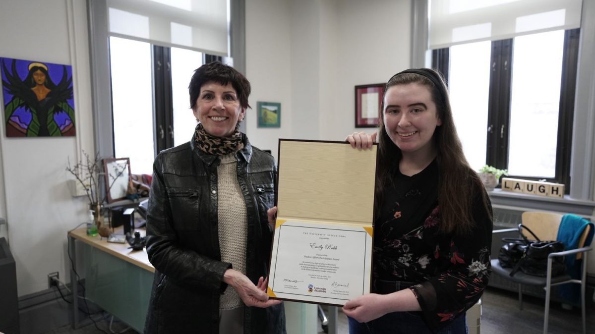 Congratulations to Emily Robb, who was unanimously selected as the recipient of the 2023 Student Affairs Participation Award by this year’s committee. The award aims to recognize a student who has maintained high academic achievement while making a significant voluntary contribution to UM and/or the broader community. This year’s award was presented on April 28, by Laurie Schnarr, Vice-Provost Students.