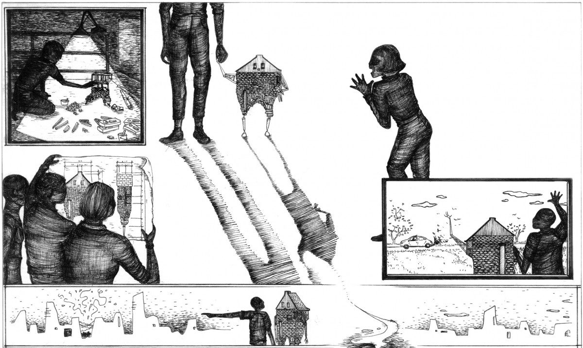Yang’s winning poster, entitled The History and Myth of Lu Ban, presented a graphic novel-like conversation between the mythic Greek architect Daedalus and the comparable figure in Chinese history Lu Ban. The imaginary dialogue about poetic and ballistic construction is based on readings of primary sources, including the philosophical texts of Mozi (a rival of Confucius) and the mythology of Lu Ban, recorded in chronicles of the Tang Dynasty.