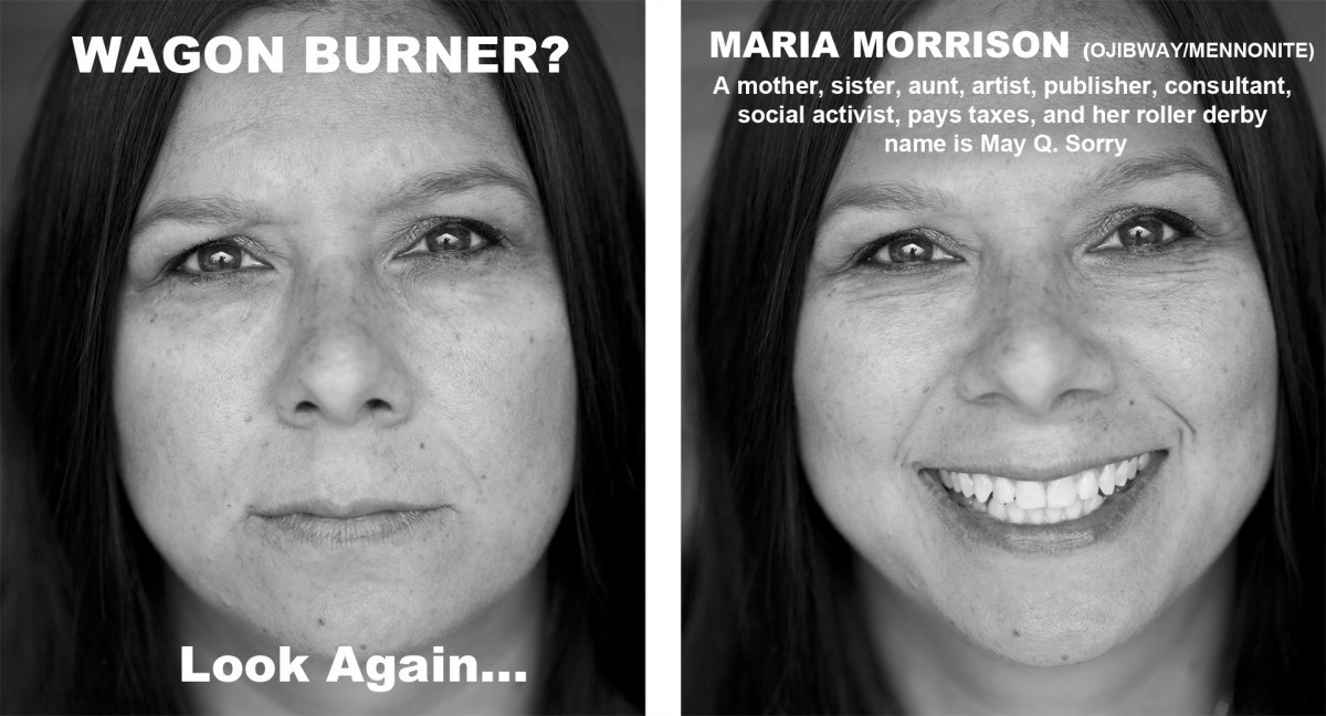 Instead of Wagon Burner, Maria Morrison (Ojibway/Mennonite) is a mother, sister, aunt, artist, publisher, consultant, social activist, pays taxes, and her roller derby name is May Q. Sorry.