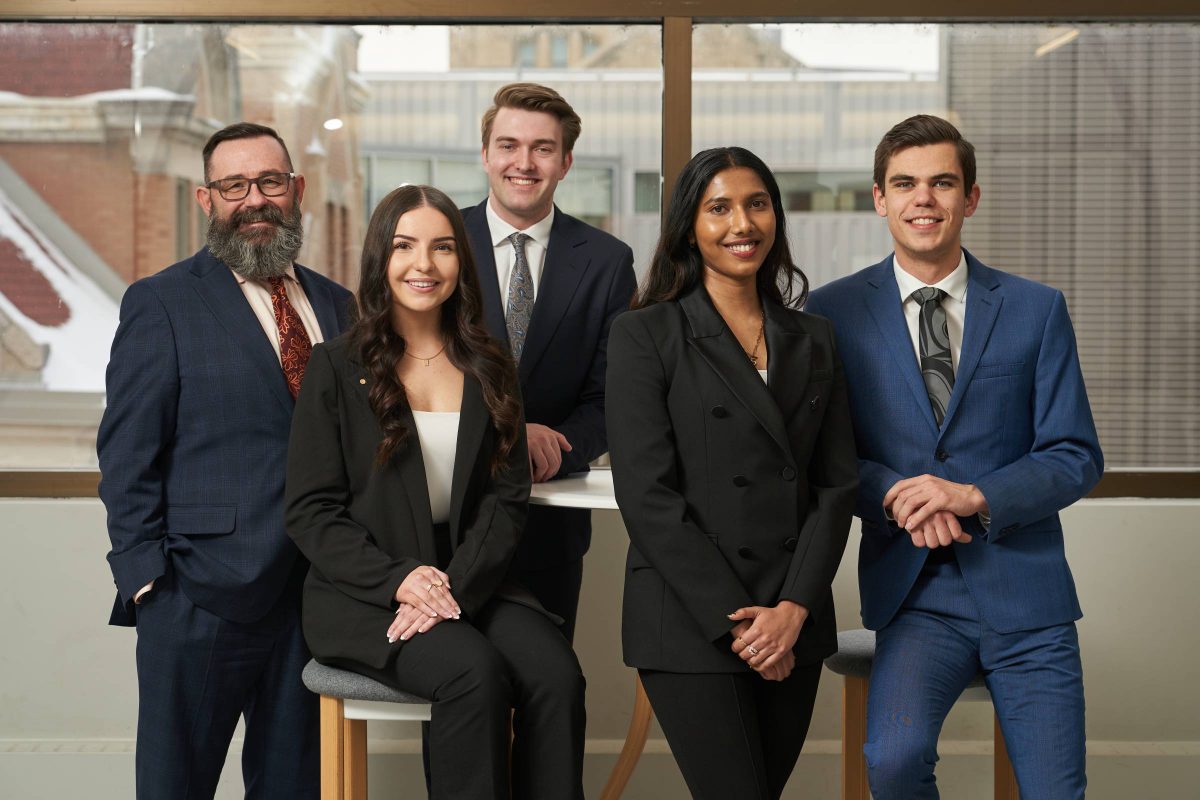 Asper Associate Dean Robert Biscontri with students Taylor Bially, Joshua Peterson, Sanjana Sabu and Tyler Roslinsky. Photo by David Lipnowski.