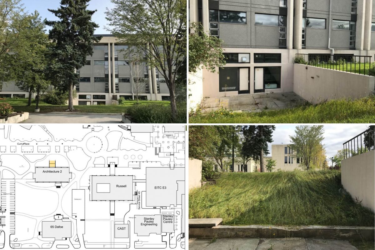 The task is to design, layout, and detail steps or stairs to the sunken patio on the northside of the Architecture 2 Building. Barkman Concrete Ltd. is expecting compelling ideas for an inviting spatial solution that includes areas to sit, learn, linger, relax etc. outside of room 121B. Room 121B is a studio space and has two doors that open to the rear patio which slopes upwards 2.50m, in between existing concrete walls. You are encouraged to experiment with features (wood, plants etc.) to compliment the stairs.