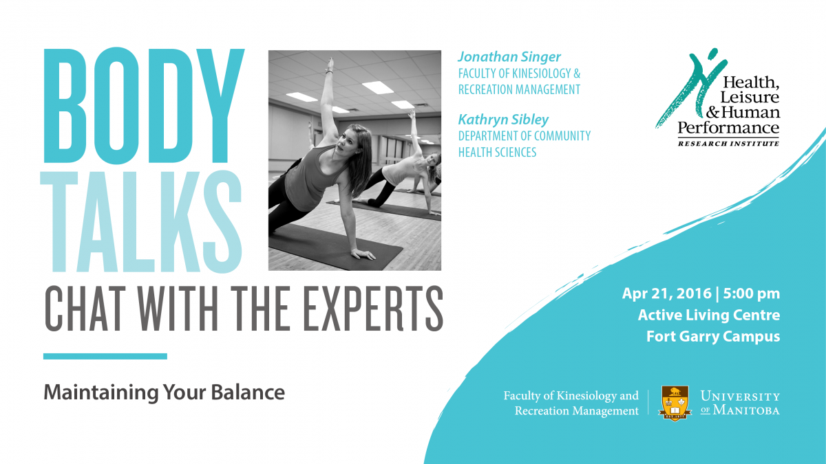 Join us for Maintaining Balance, the last installment of the 2015-16 season of Body Talks, as UofM experts discuss how balance is maintained during movement, along with best-practice recommendations for maintaining balance ability with aging.