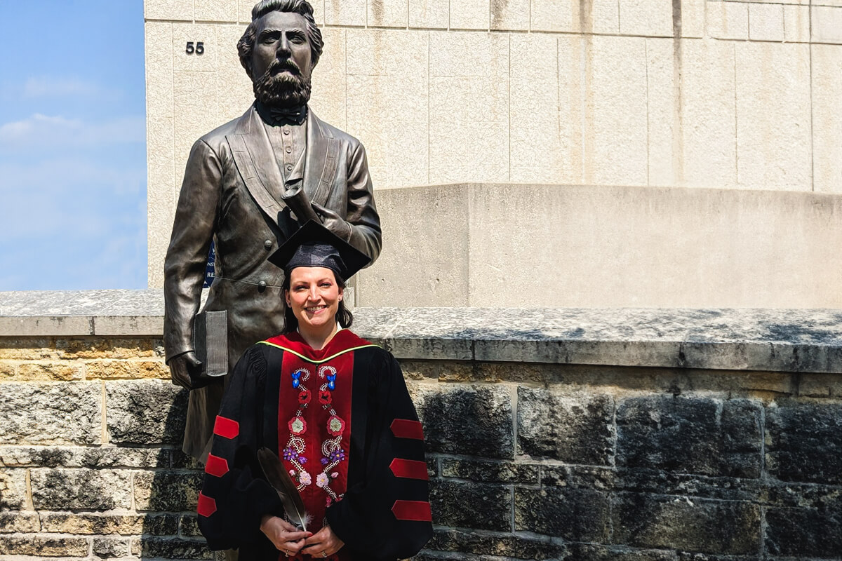 Laura Forsythe on graduation day, in front of the statue of Louis Riel near Migizii Agamik.