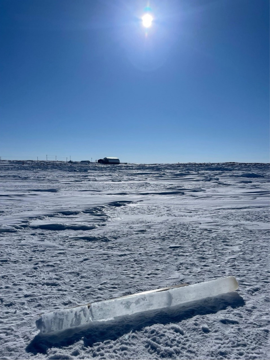 Image 3: An ice core from Hudson Bay with the CMO in the background. The bottom of the core is brown due to the growth of sea ice algae. Credit: Maeva Gremaud.