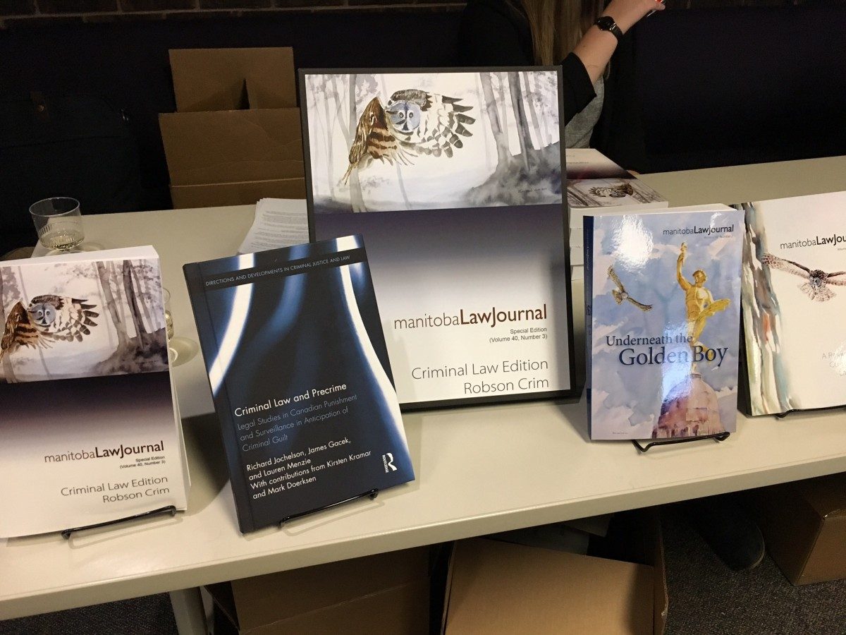 Robson Hall hosted a very special book launch on October 18 celebrating multiple volumes of academic work of its Faculty in a mega launch event. The event was a celebration of the Manitoba Law Journal’s resurgence as a leading force on the Canadian Law Journal Scene with the release of its Great Transition issue (providing an oral history of the Faculty), the general edition, Underneath The Golden Boy (dealing with legislative governance in Manitoba), and marking the inaugural release of the double issue of the Criminal Law Edition (the MLJ Robson Crim issue).  The resurgence of the journal was heralded under the stewardship of Professors Bryan Schwartz and Darcy MacPherson. The event marked the release of the Asper Review, in the glare of its rise up the international rankings for specialty journals. The event also featured the launch of a Robson Crim International collaboration between Robson Hall’s Richard Jochelson, James Gacek (University of Edinburgh), and Lauren Menzie (Carleton University).