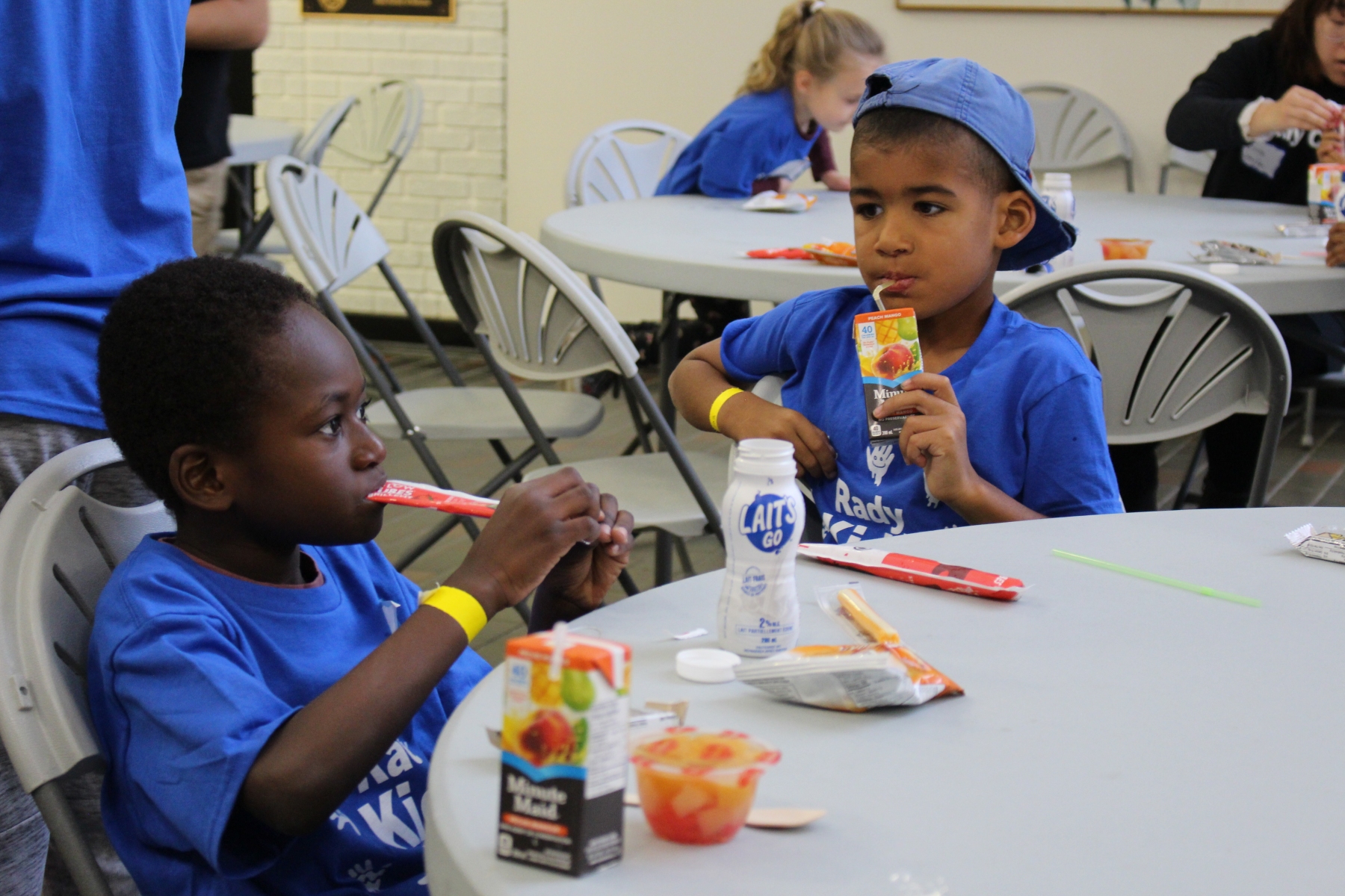 One child smiles with his arms stretched out. Another child drinks from a juice box.