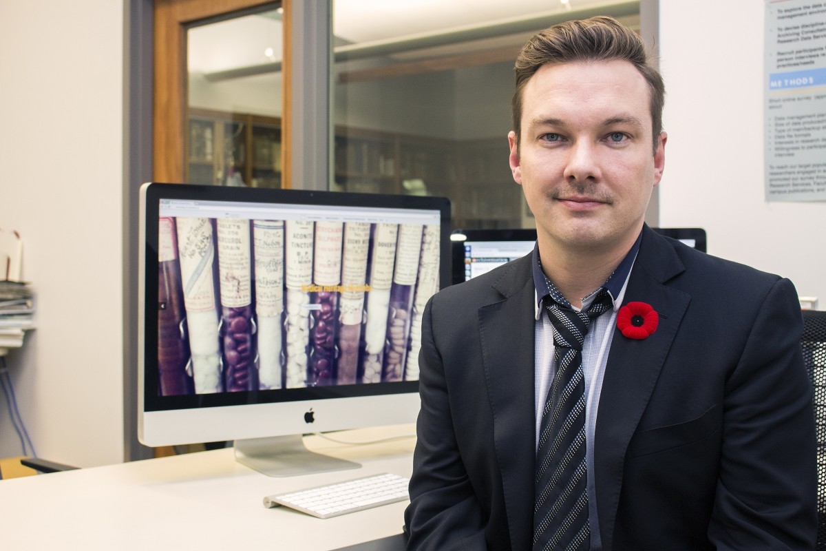 Jordan Bass, Medical Archivist, Health Sciences Library. The Digital Archives website can be seen on the screen behind him.// Photo: Garrick Kozier