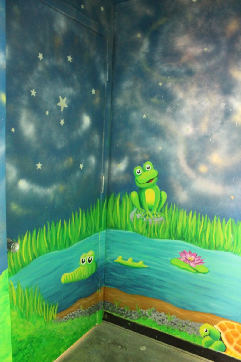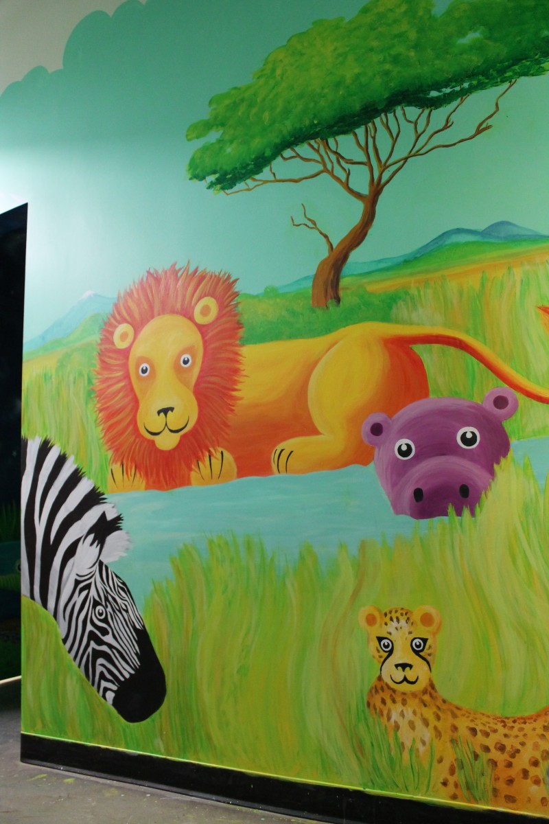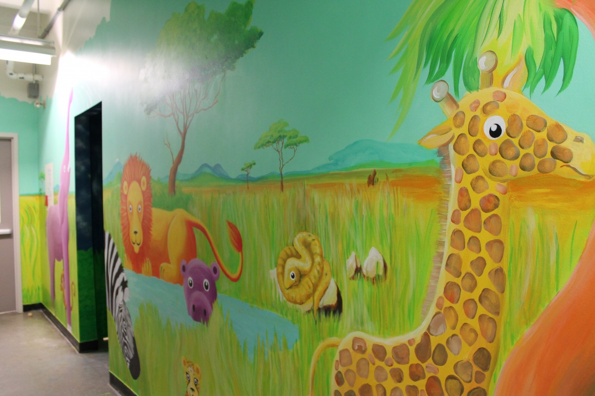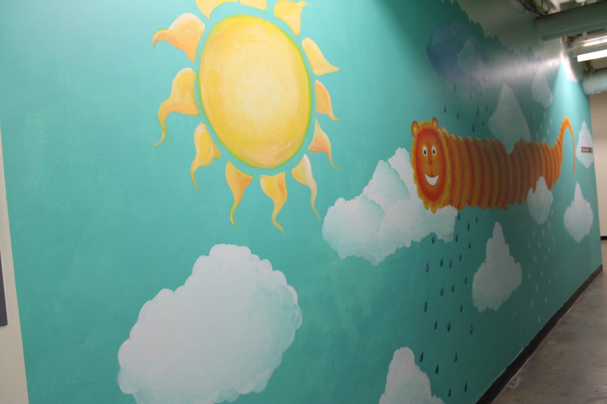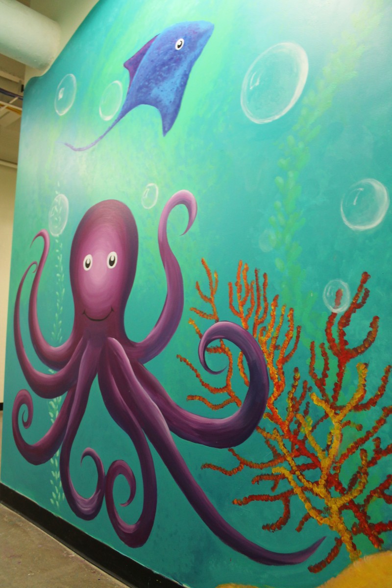 The mural covers the walls from floor to ceiling. Painted over a blue background, the mural is composed of an underwater scene on one side of the corridor and a blue-skyed, above-ground scene on the other side, a rainy day scene, and shifts to a night scene, nestled into a small nook of the hallway. Each of the sections includes animals, from domestic farmyard animals to exotic safari creatures to otherworldly underwater creatures.
