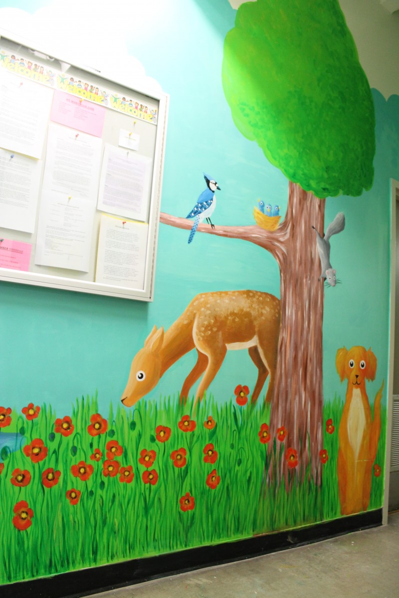 This year, when children arrive at the PlayCare Centre in the basement of University College, there will be something special to welcome them. Anya Nikoulina, a young artist from Winnipeg, has been working on a colourful, expressive large-scale mural that begins in the hallway and lines the entire corridor of the entrance to the centre. Commencing her work in March 2013, Nikoulina volunteered her time and skills. Shawn Jordan, communications staff with the Faculty of Arts, calls her volunteer work and the mural “a magnificent act of generosity and creativity.”