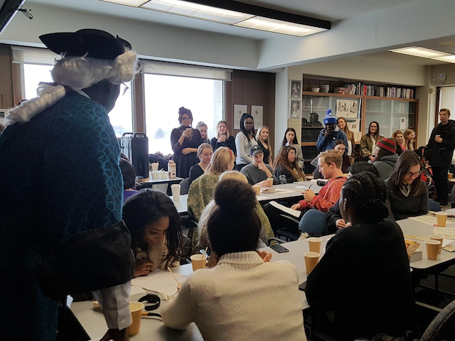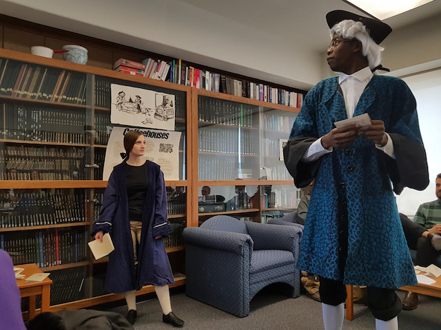 “It’s natural to ask why you are learning about something and why it is important,” says Alexa Watson, a student in Keating’s Literature of the Restoration and Eighteenth Century course who helped organize the replica coffeehouse.