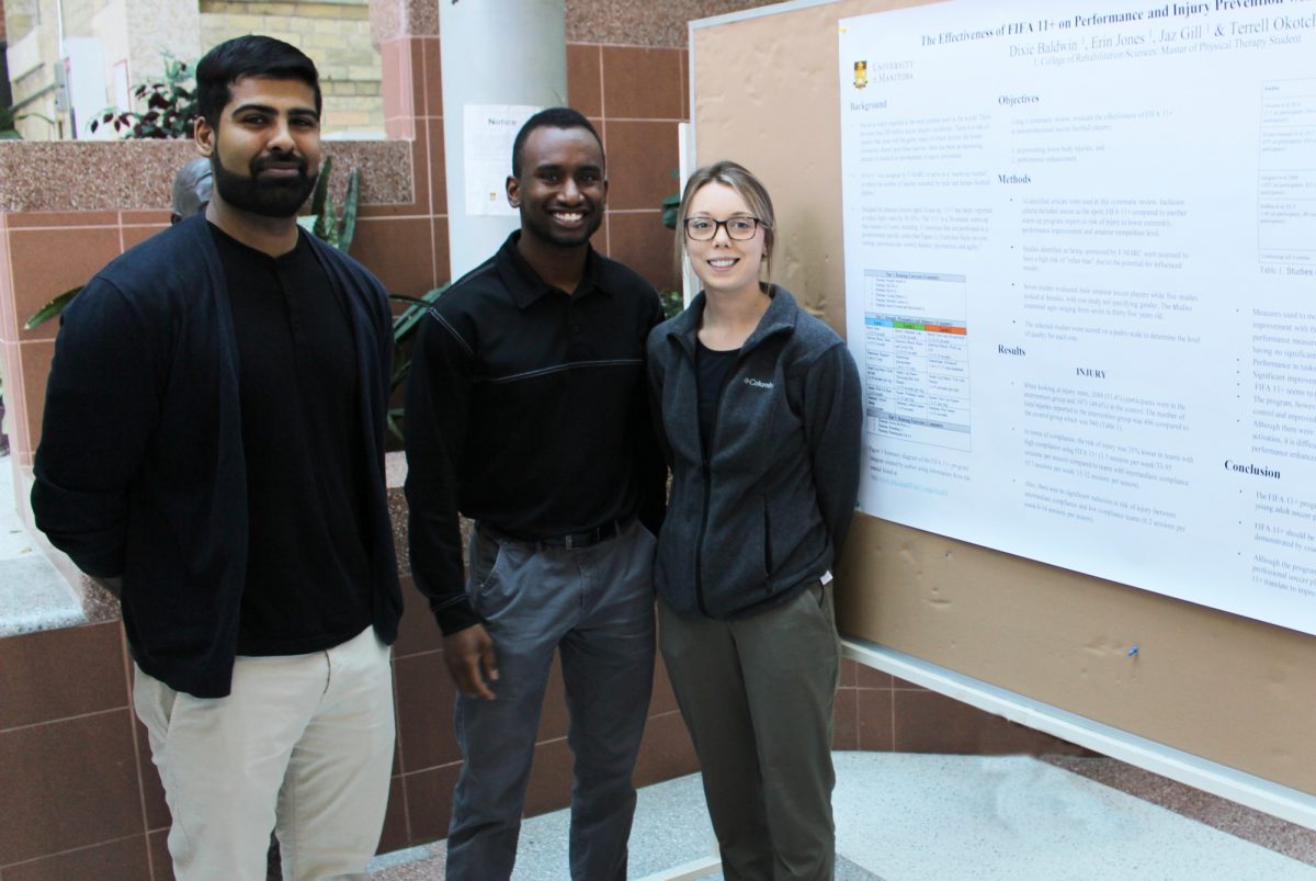 Jas Gill, Terrell Okotcha and Dixie Baldwin presented their research into the effectiveness of FIFA 11+, a fitness module created by the FIFA world soccer federation at the CoRS Student Research Symposium.
