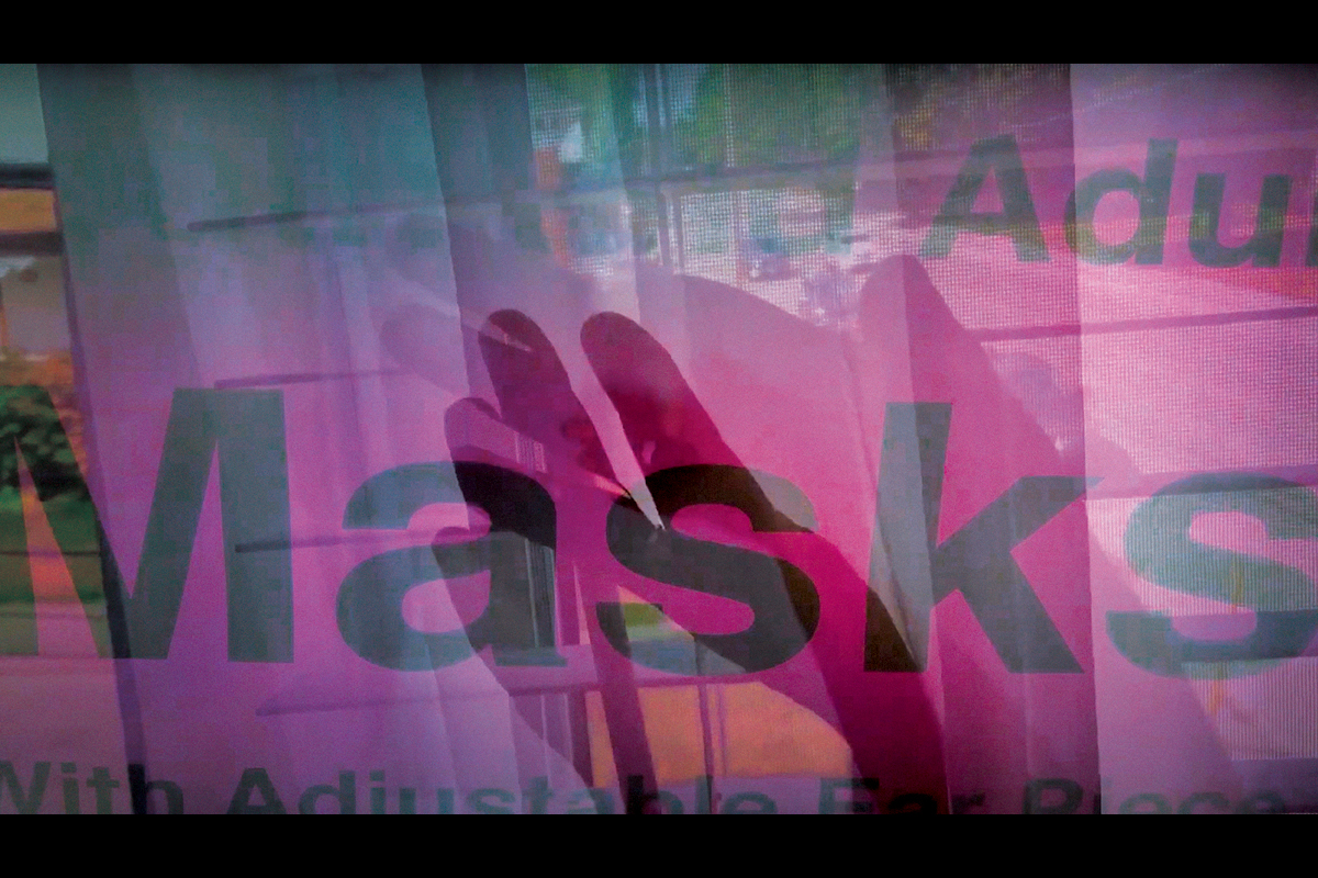 This video still is composed of multiple layers including hands, curtains, street traffic and pink mask signage. The hands convey elements of intimacy and loneliness as they travel across the screen. The pink signage creates an additional dimension of complexity as it highlights the signifigance of wearing a mask. The distance between the street traffic and the camera itself creates a sense of isolation or seperation from the people outside, reflecting further on the themes of anxiety and loss.