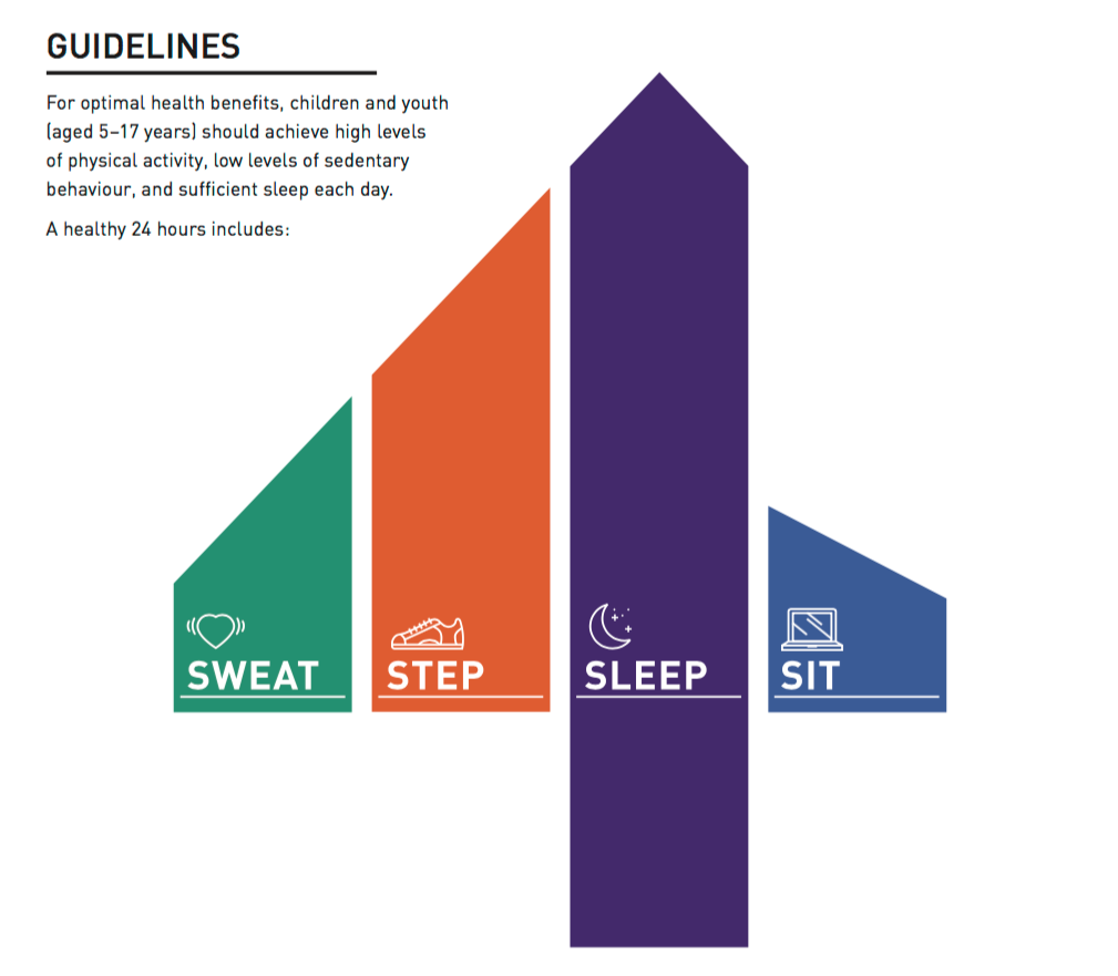 The new Canadian 24-Hour Movement Guidelines for Children and Youth encourage children and youth to “Sweat, Step, Sleep and Sit.”