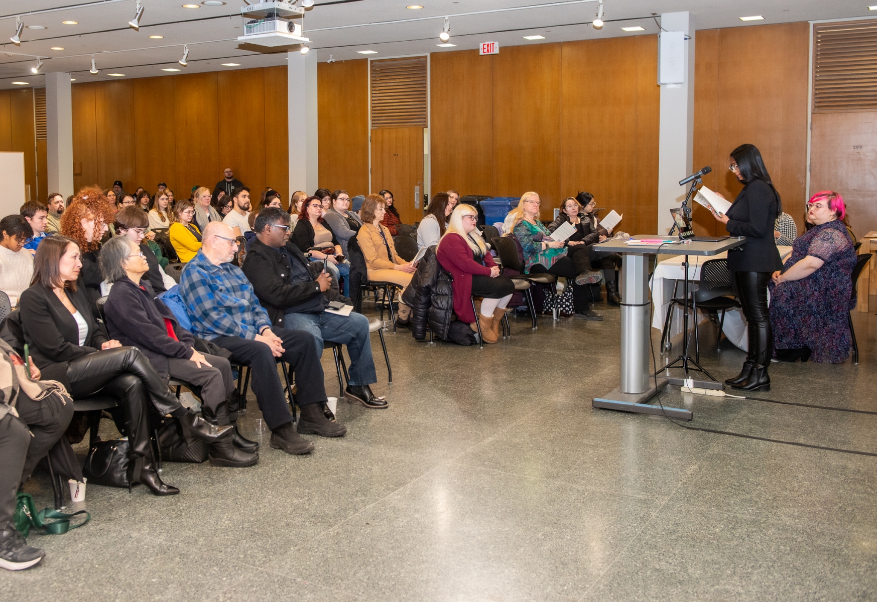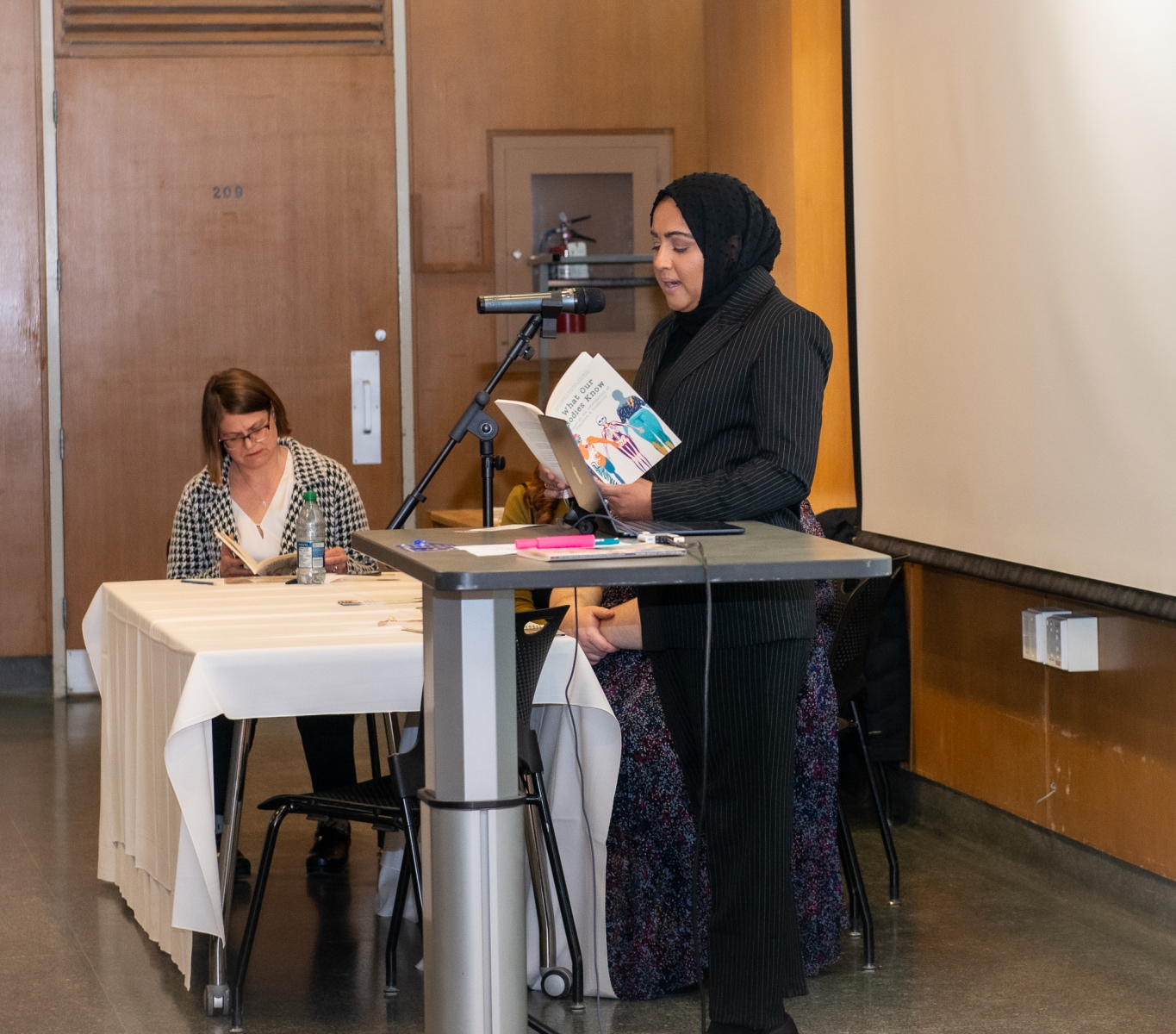 Student Anamika Deb, a political studies major and WGS minor, admitted that at first she was “scared to expose” herself, “I drew a blank on what to write about because my disability is not visible.” She explained that once Dr. Stewart confirmed her sciatica qualified as a topic, it ended up being comforting to write about it and then share it out loud to the crowded room. “A horrible experience led to an amazing thing,” exclaimed Deb with a smile on her face as she held up the book and gestured to her parents and brother who came to support her at the event.
