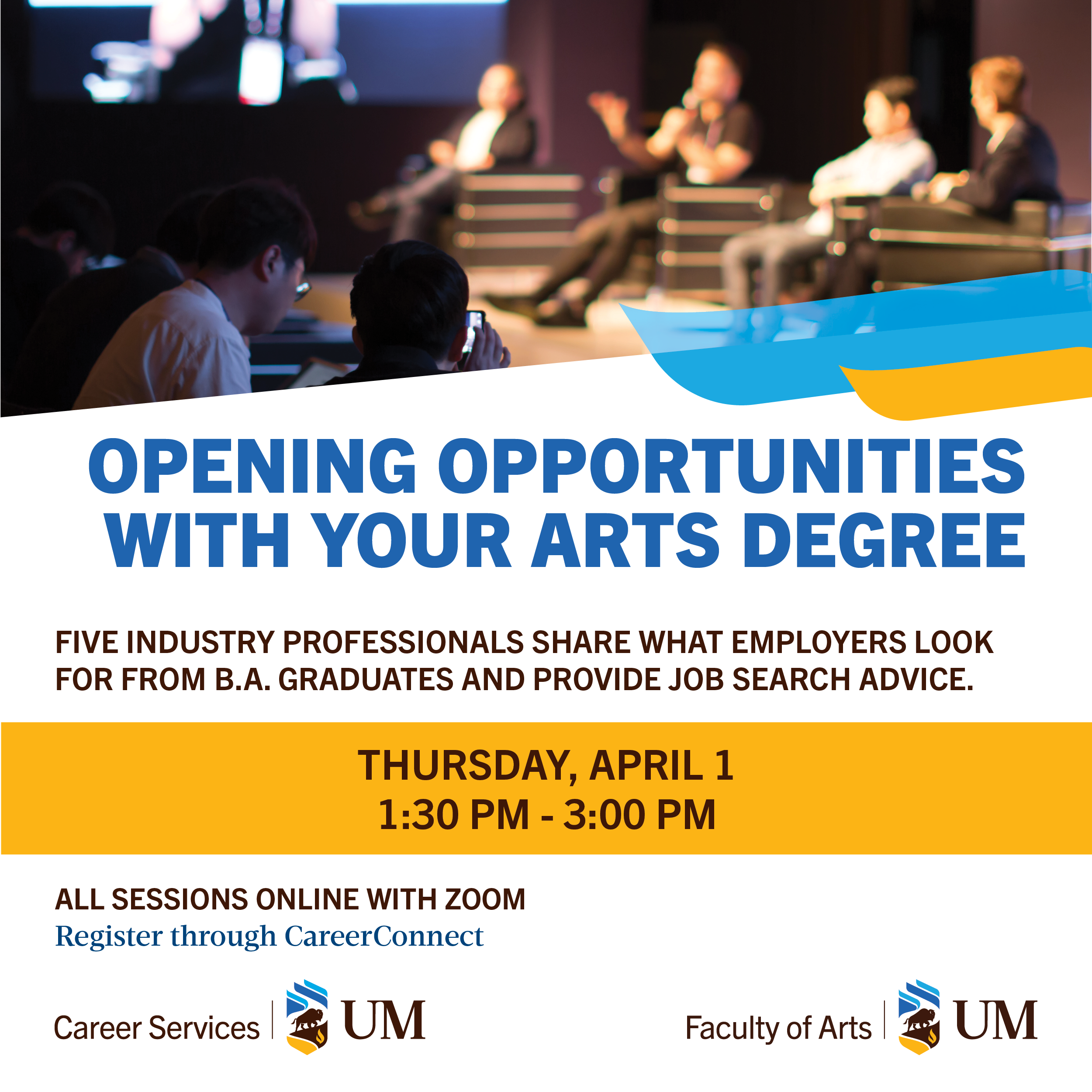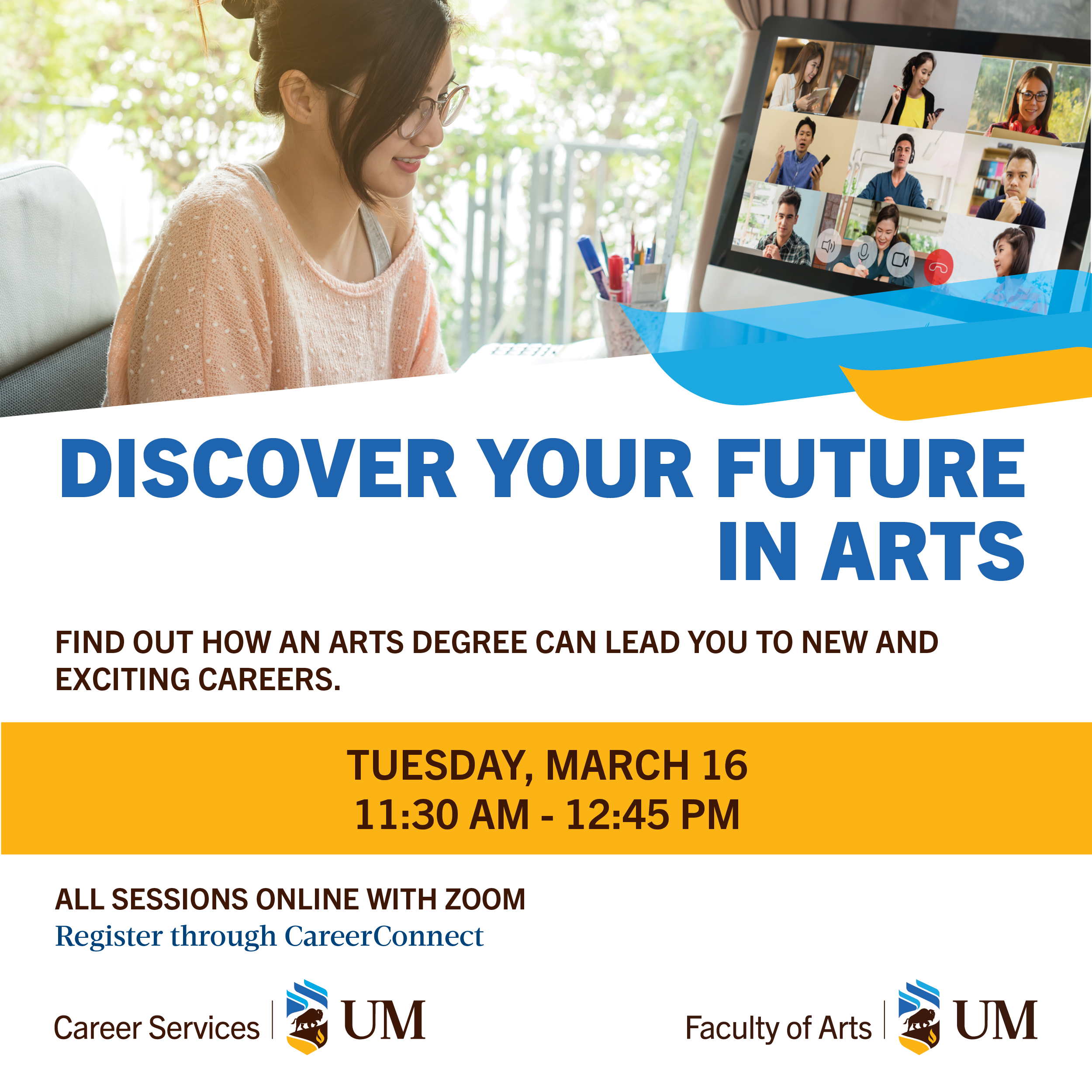 The series kicks-off on Tuesday, March 16 with a lead presentation where students will learn about the many areas of study offered in Arts and the resources available to help students plan their studies to align with future job interests. Students will also hear from Arts alumni who will share their academic and career paths as examples and provide recommendations along the theme of “if I could go back in time, what advice would I give myself”.