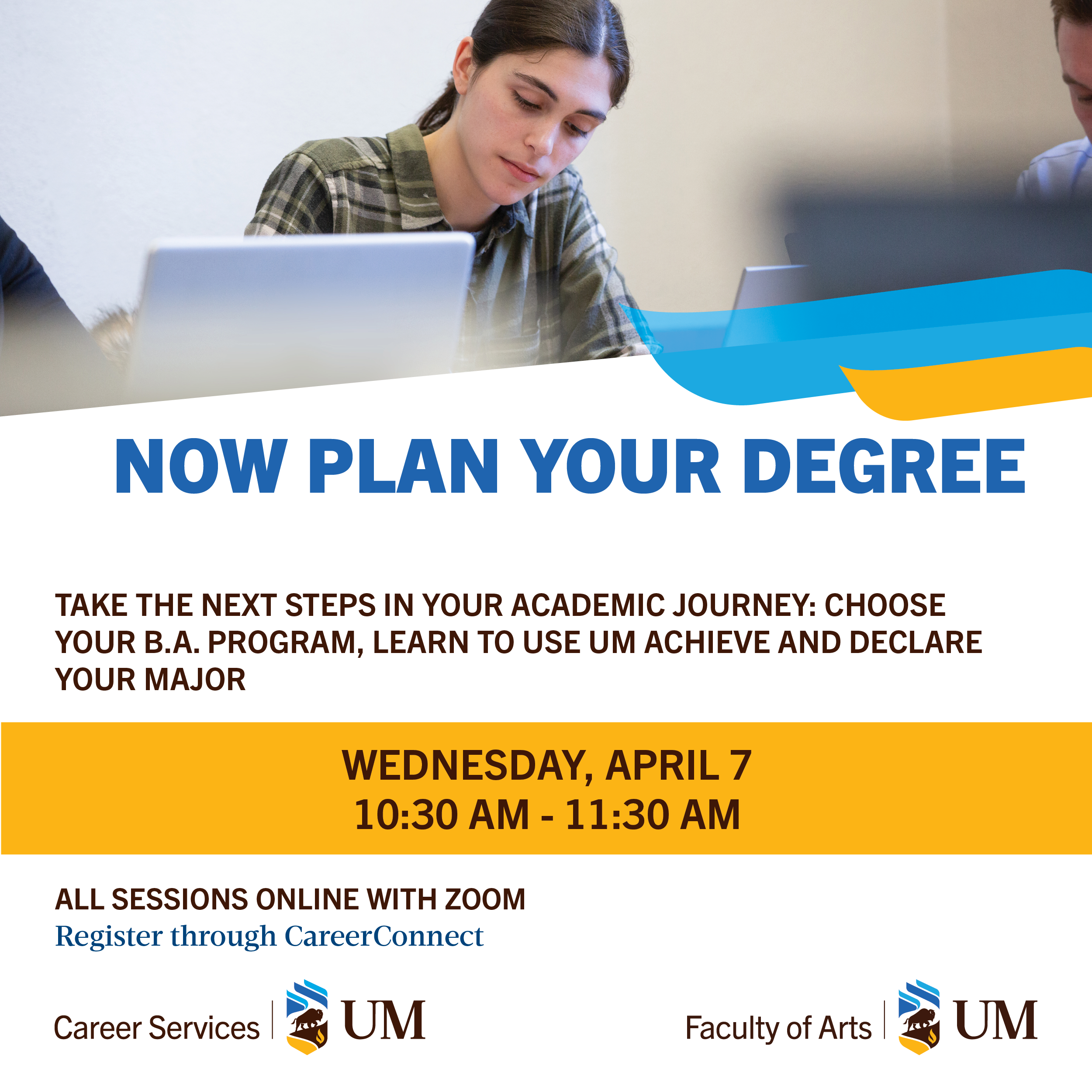 From March 16 to April 7, the Faculty of Arts and Career Services are offering a series of presentations and workshops to help students as they make key decisions about their studies and their future. Students can attend one or more of the sessions to discover the many academic and occupational options available.