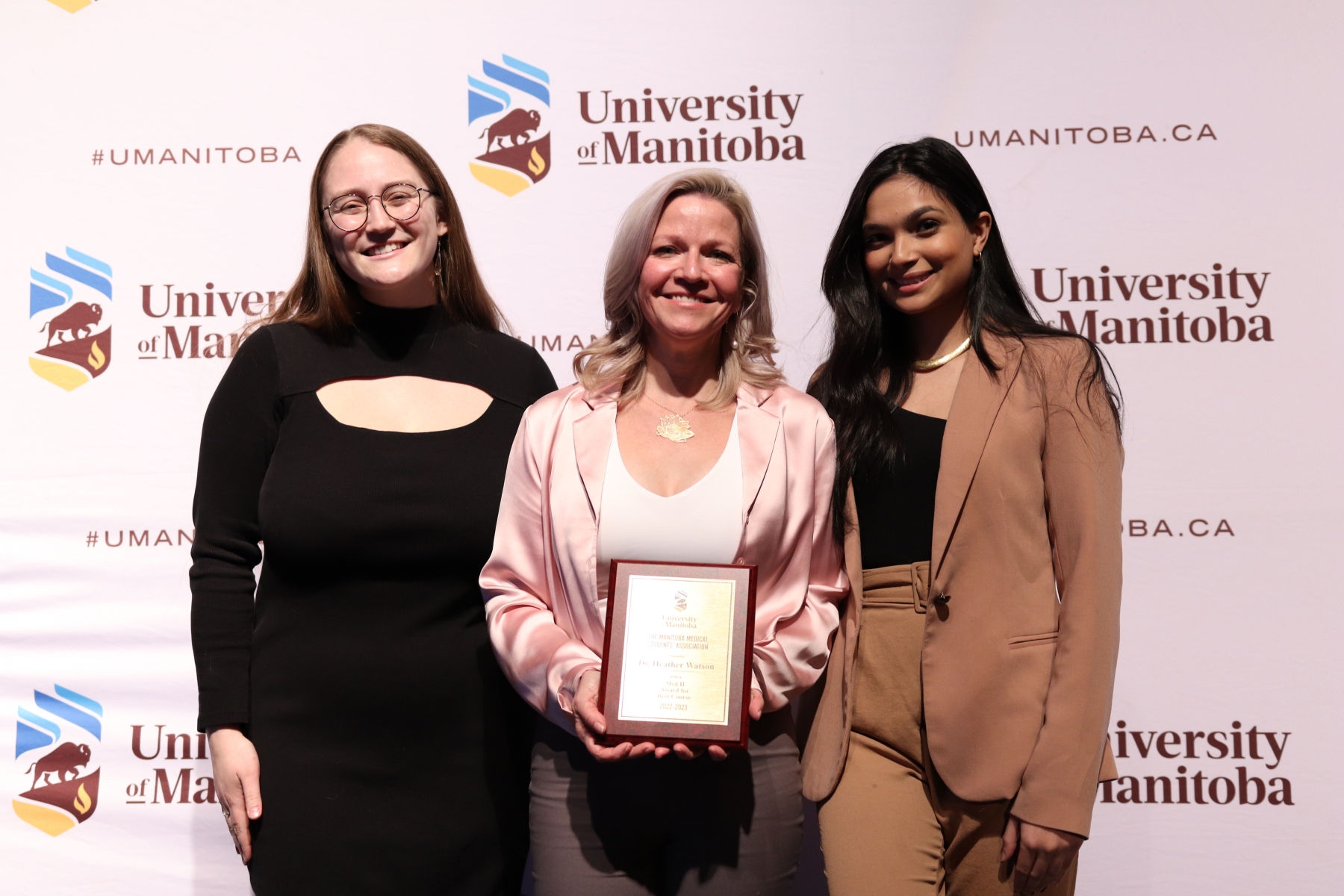 Dr. Heather Watson accepts a teaching award from two medical students.