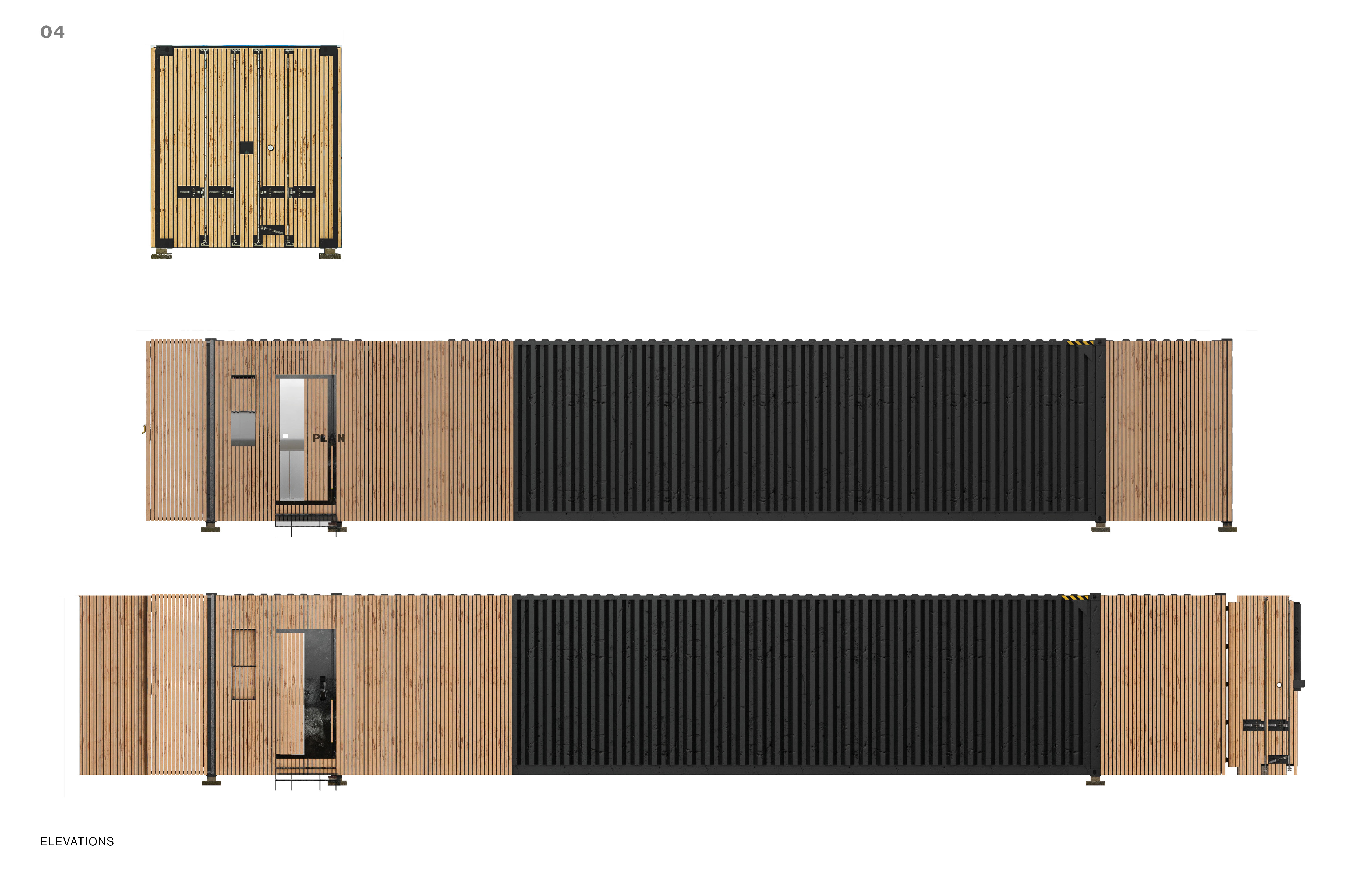The exterior is designed as a pavilion for teaching and learning while the interior is designed as a laboratory for safety and efficiency. The exterior is painted black and cladded with vertical wood slats. The front is extended to conceal the wall-mounted HVAC system. The sides are decorated with artwork and the community logo. The interior is furred out, insulated, and finished with food grade materials. The thermal resistance is ± R-36 for the floor and ± R-27 for the walls and roof. The programs include an entrance, a nursery room, a cultivation room, and a loading and viewing room. The systems include HVAC, plumbing, lighting, and power. There is a central duct for air distribution and incandescent lights for visibility throughout the Kistikêwin Container. The energy consumption is ± 1,425 kWh / month and the energy cost is ± $ 150.00 / month. The crops include romaine lettuce and sage. While other fruits, vegetables, and herbs are possible, leafy greens are more successful and romaine lettuce happens to be a community favorite. The rotation is ± 390 crops / cycle and ± 4 cycles / month. The rate of romaine lettuce is $ 2.49 each in communities across Southern Manitoba resulting in a profit of ± $ 3,885.00 / month.