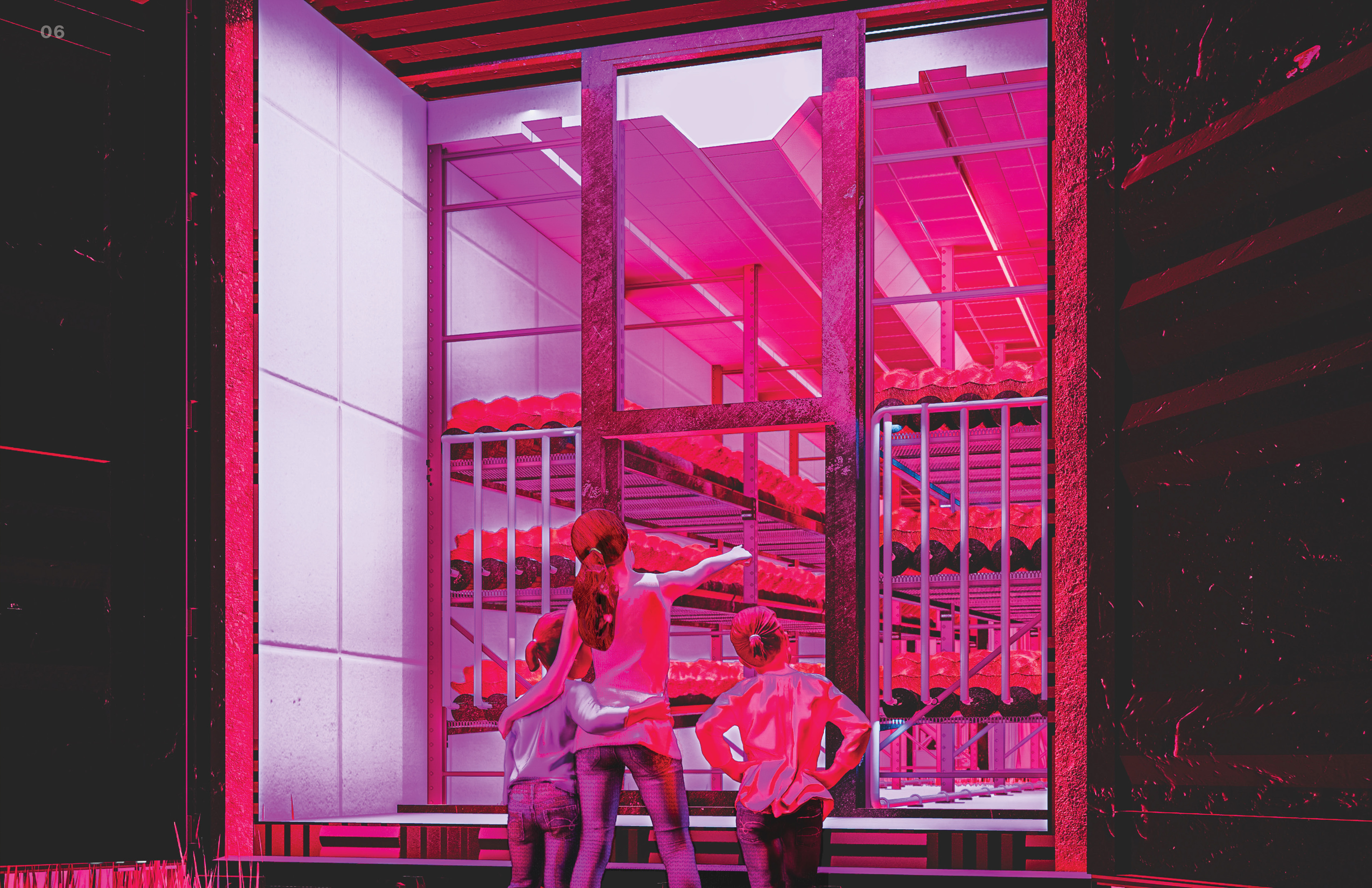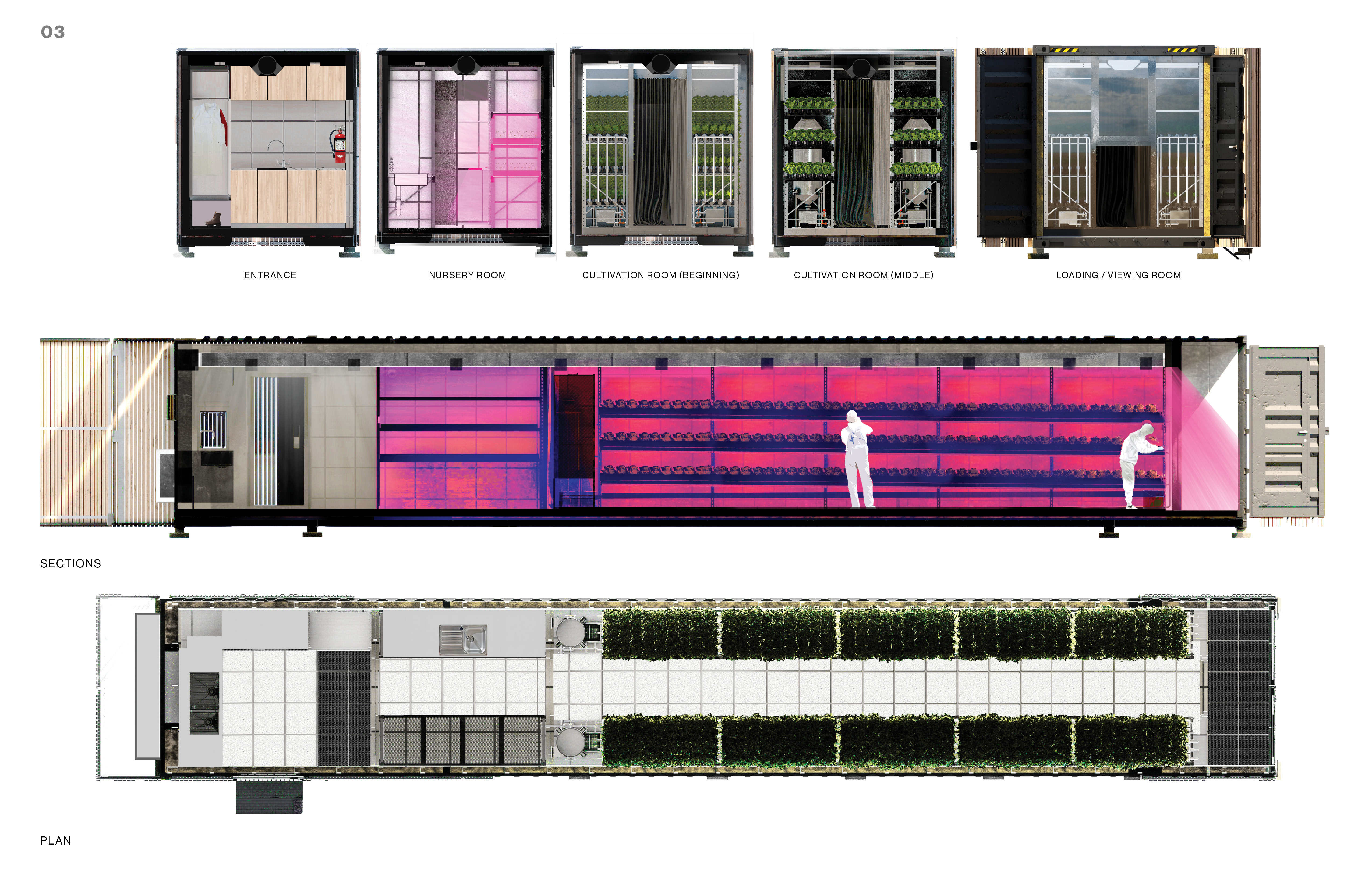 The entrance is a space for smudging and working. It is separated by a weighted curtain to prevent contamination. The glass door and window provide natural light and the custom shutters control glare. The nursery room is a space for planting seeds and transplanting small crops. The entrance and nursery room have sinks for washing, closets for storing, and computers for climate control and nutrient delivery. The cultivation room is a space for growing, nourishing, and harvesting large crops. The crops require approximately 1 month in the nursery room and 1 week in the cultivation room. The nursery room and cultivation room have stacked horizontal troughs, water reservoirs, hydroponic irrigation, and red / blue LED lights. These are the most successful colours for photosynthesis. The loading and viewing room is a space for packing and sharing. It is separated by a glass wall and door to protect the unpacked crops. Once the crops are packed the back opens for access and transparency, revealing the process. Kistikêwin Container casts a purple glow, illuminating the horizon and inviting the community to gather.