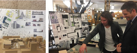 Students in Professor Brenda Brown’s EVLU 4012, Studio 5, presented their designs at City Hall as part of the launch of a year-long public engagement process for development of Winnipeg’s former Public Safety Building and parkade site. Mayor Brian Bowman, who was the key speaker at the January 17, 2017 event, reviewed and discussed each of the designs with the students. Studio 5 has been working with Centre Venture Development Corporation on this Market Lands Initiative. The projects will be on display at City Hall until January 20 and also available on the Centre Venture website.