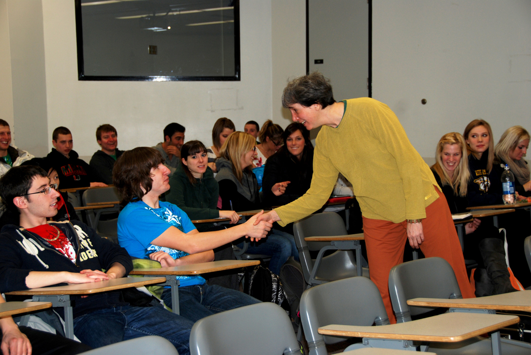Joannie Halas, professor in the Faculty of Kinesiology and Recreation Management, greets a student on the first day of class.