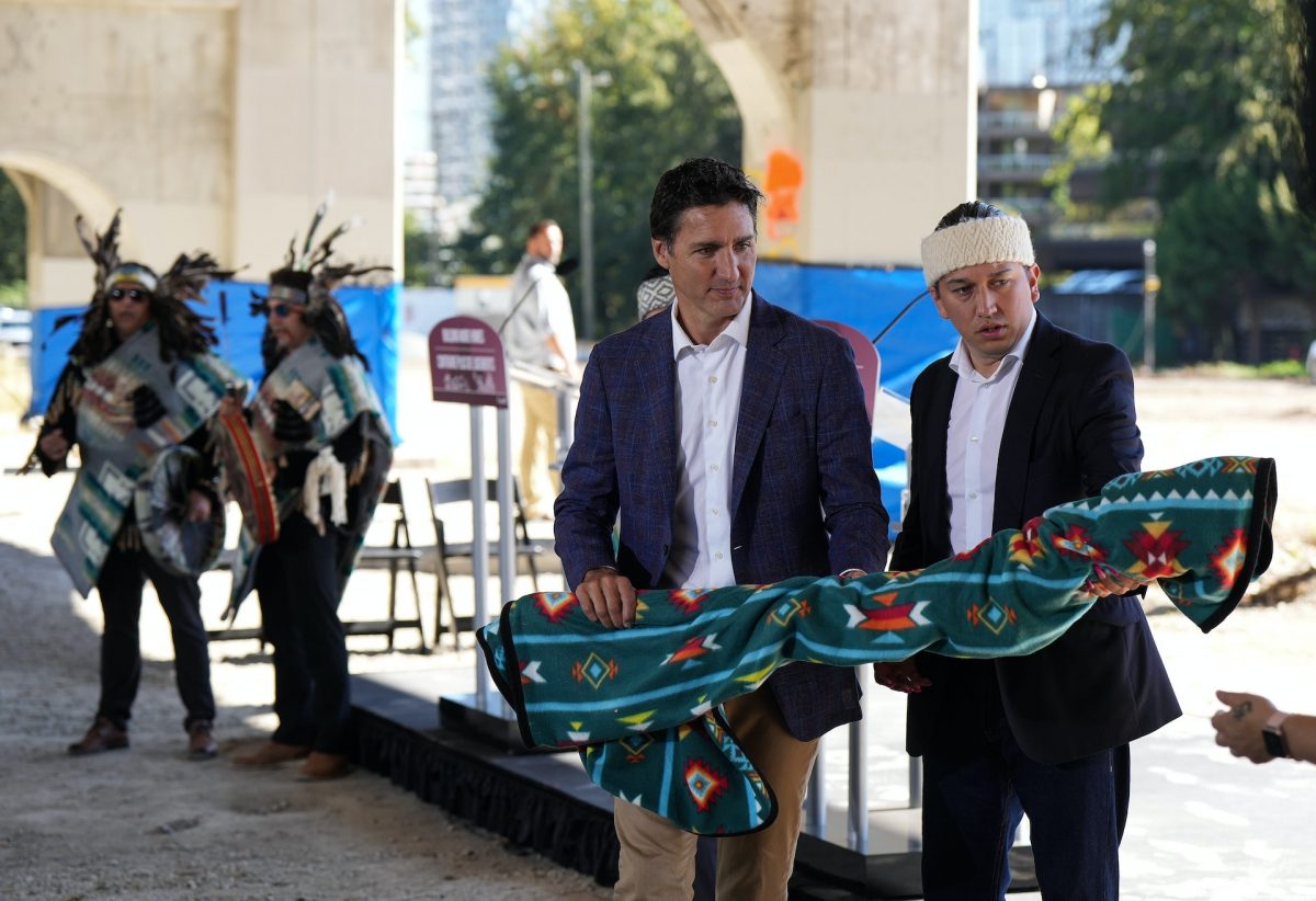 Prime Minister Justin Trudeau and Squamish Nation councillor Khelsilem hold a ceremonial paddle after a groundbreaking ceremony at the First Nation’s Sen̓áḵw housing development site in Vancouver in September 2022. THE CANADIAN PRESS/Darryl Dyck.