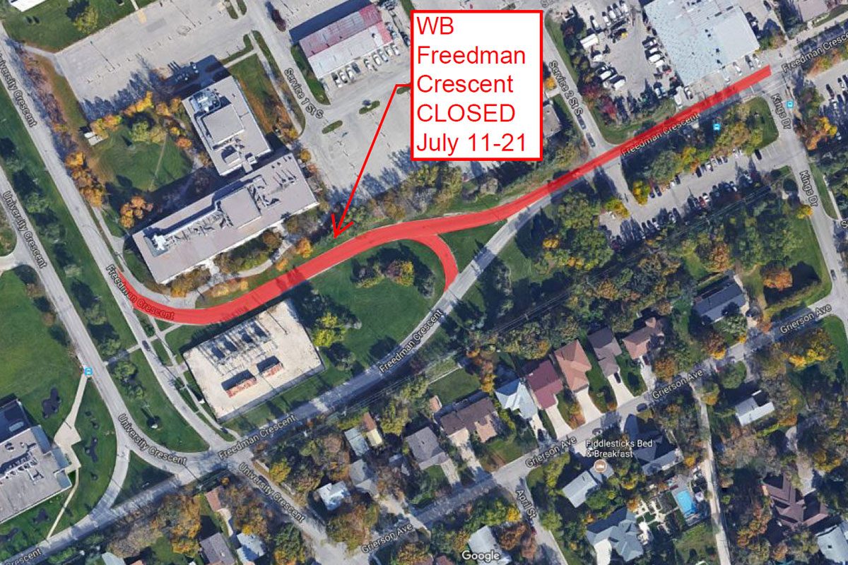 Freedman Crescent (westbound) will be closed for repairs from University Crescent to King’s Drive from Tuesday, July 11 to Friday, July 21.