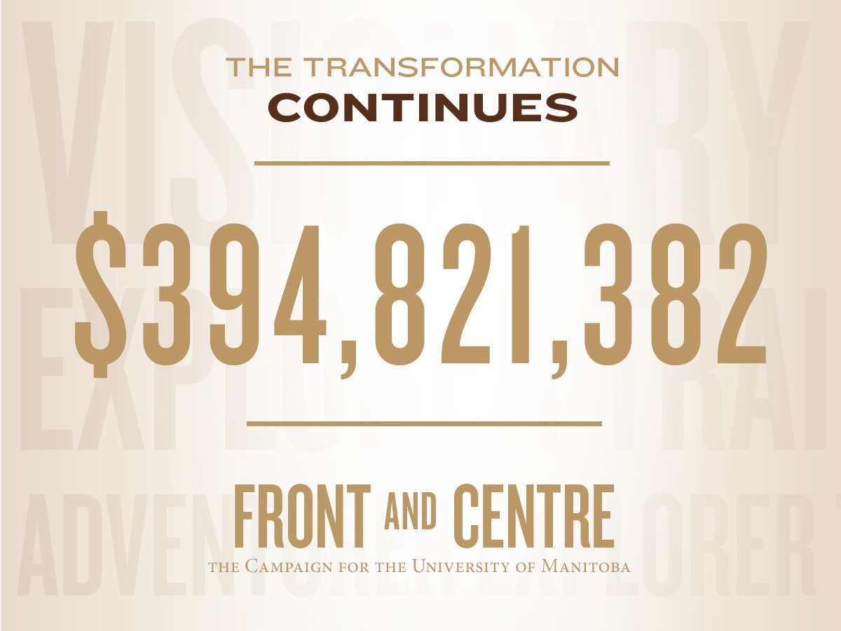 Today, the University of Manitoba announced a major landmark in the ongoing Front and Centre campaign to raise $500 million, the largest philanthropic investment in the history of Manitoba.