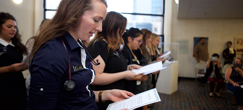 PHYSICIAN ASSISTANT STUDENT KALI BRAUN (FOREGROUND) TAKES THE HIPPOCRATIC OATH WITH HER CLASS.