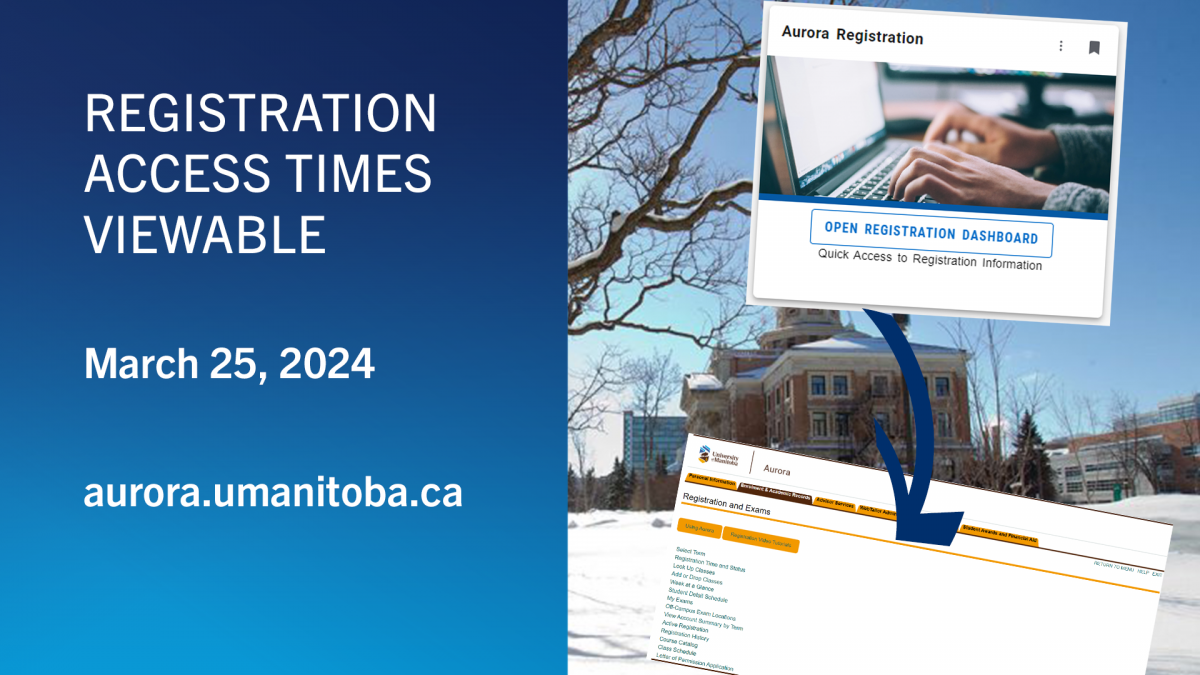 Registration access times for students at the Bannatyne and Fort Garry campuses will be available in your Aurora account on March 25. To view your registration time:
