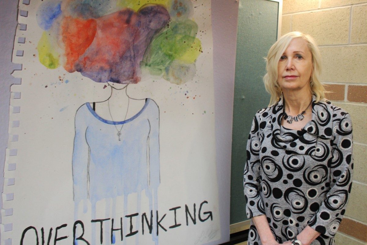 Dr. Roberta Woodgate poses with artwork created by a youth in her anxiety research study. She will use similar arts-based methods in two projects recently funded by the Canadian Institutes of Health Research (CIHR).