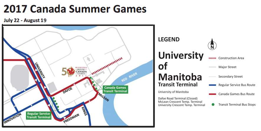 Winnipeg Transit’s bus stops currently located along Maclean Crescent have been moved to University Crescent to accommodate the additional Canada Summer Games bus traffic.