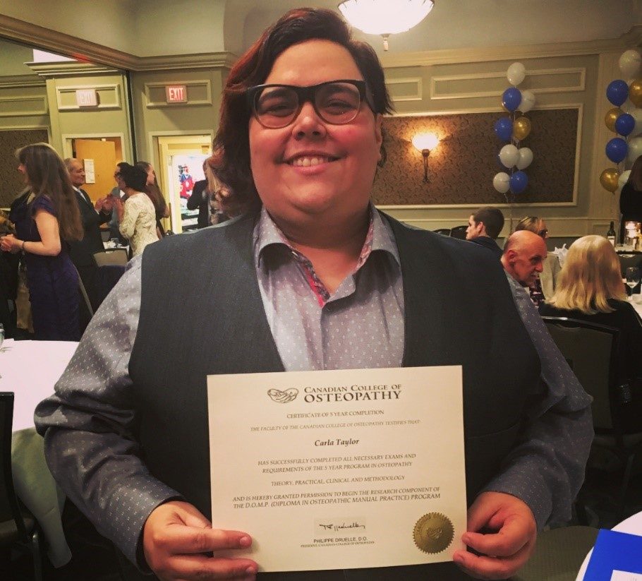 Carla Taylor holds their certificate from the Canadian College of Osteopathy.