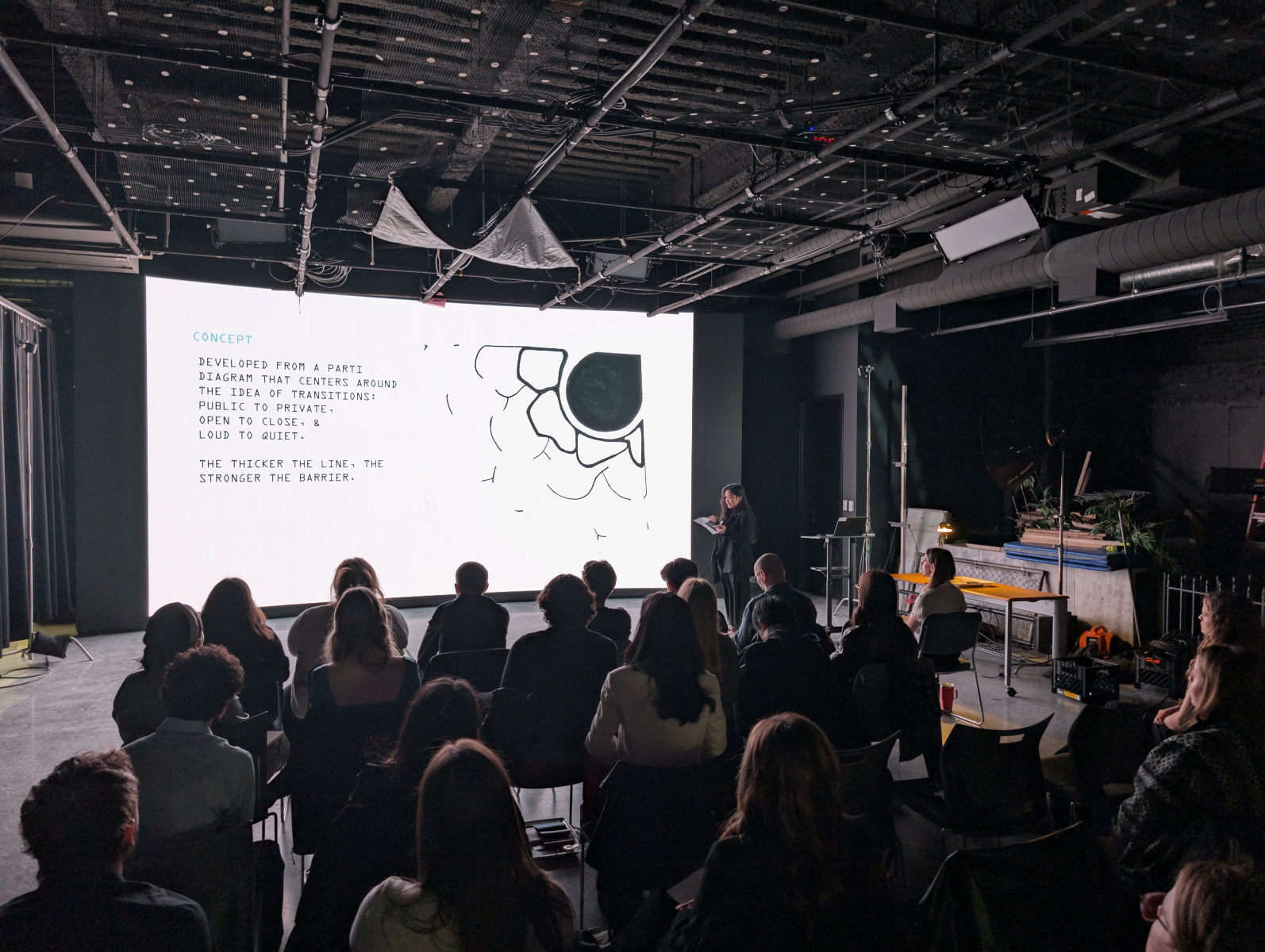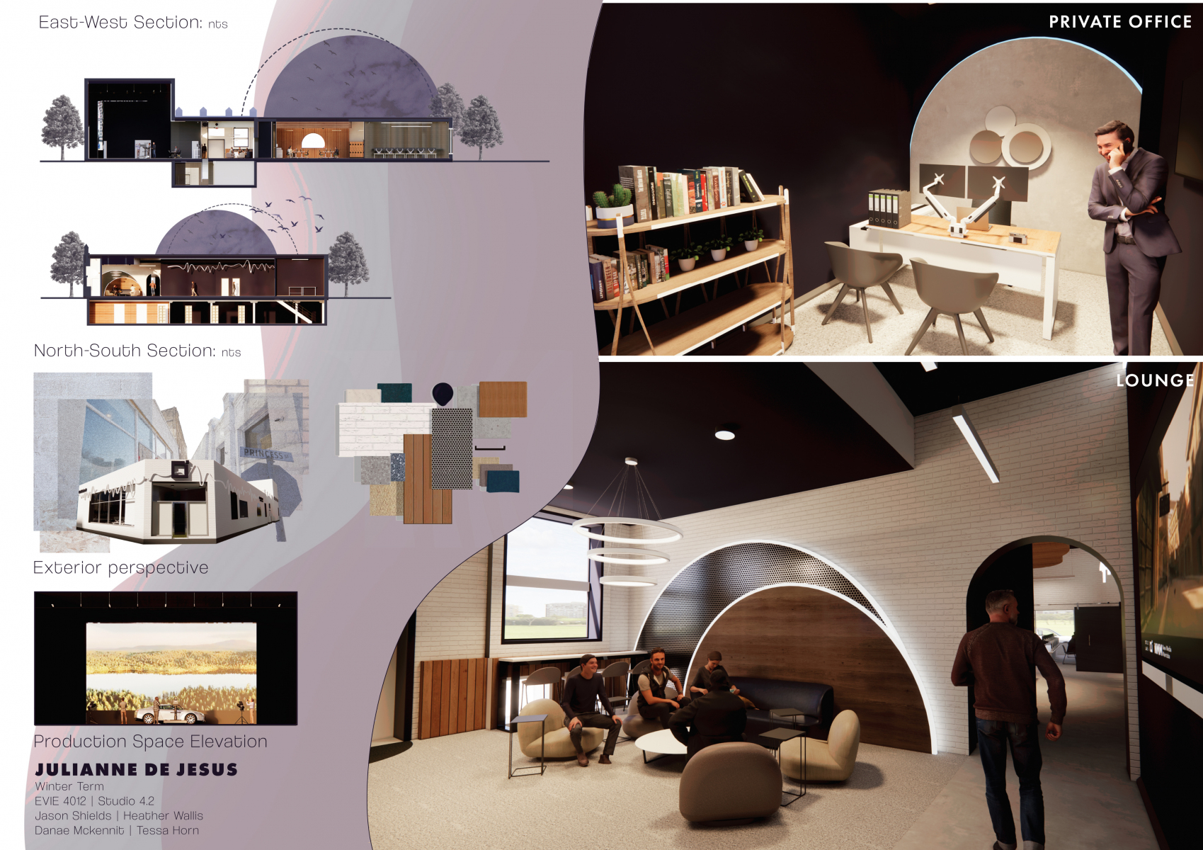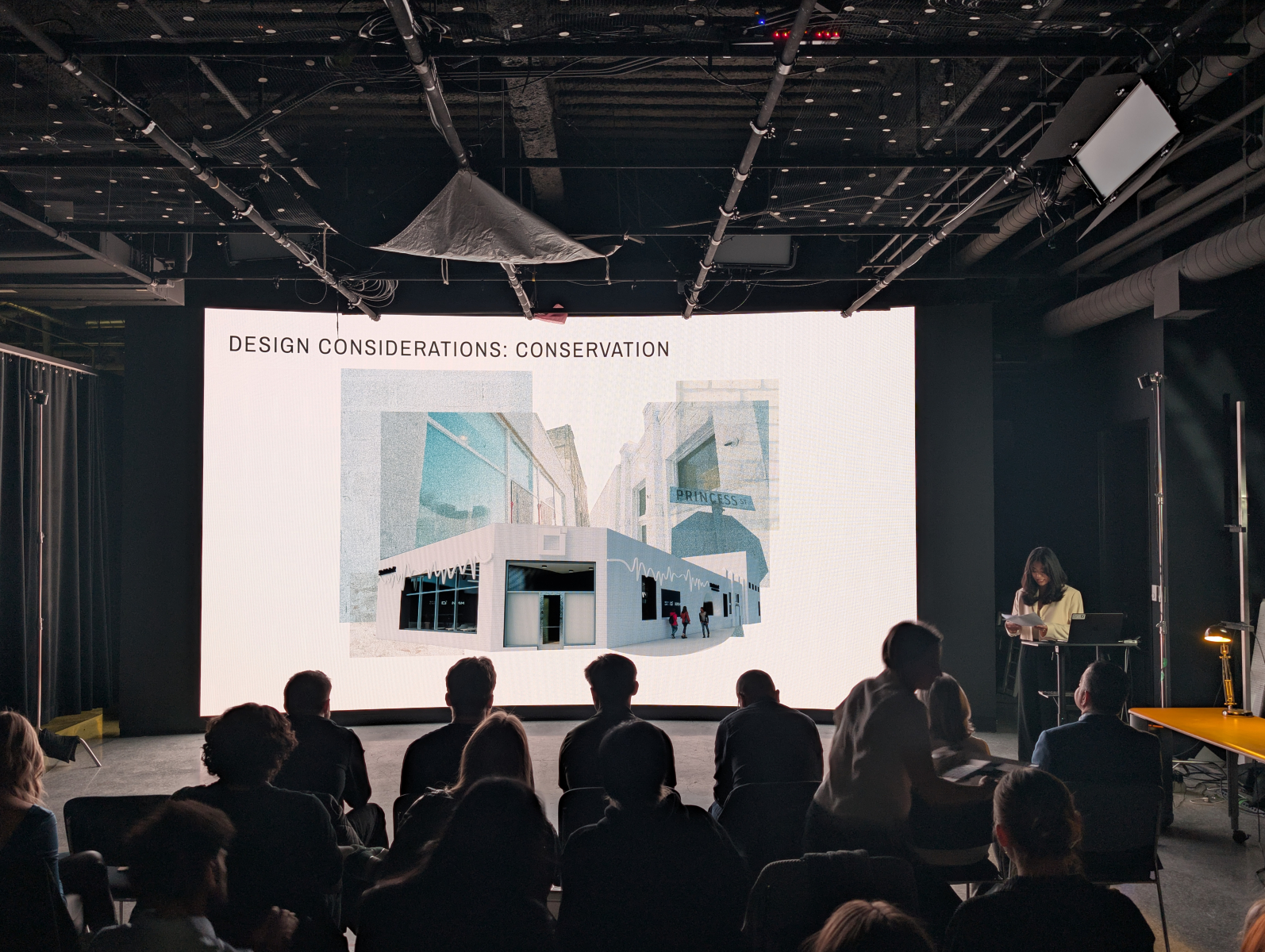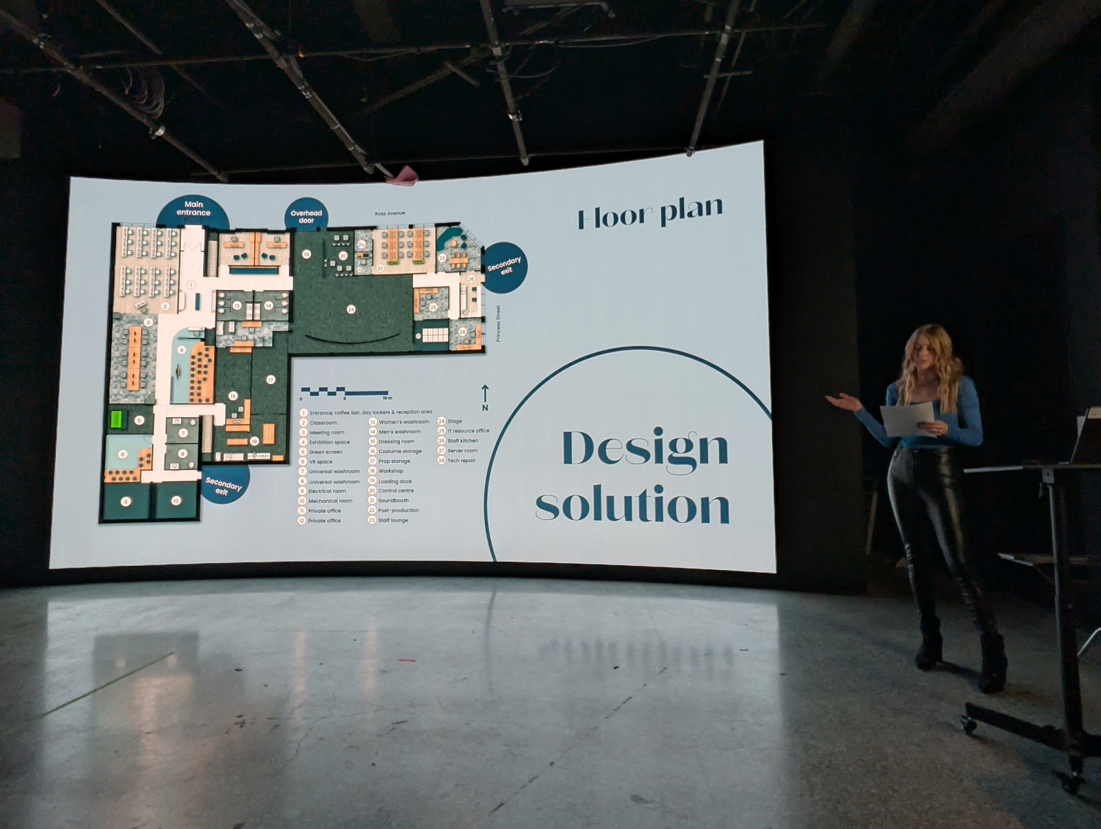 Final presentations were held over four sessions on April 8th and 9th within StudioLab xR’s facility at 201 Portage Avenue. Students presented their comprehensive design proposals utilizing their 24′ x 11′ LED volume wall, showcasing detailed presentation drawings, 3D renderings, and video walkthroughs.