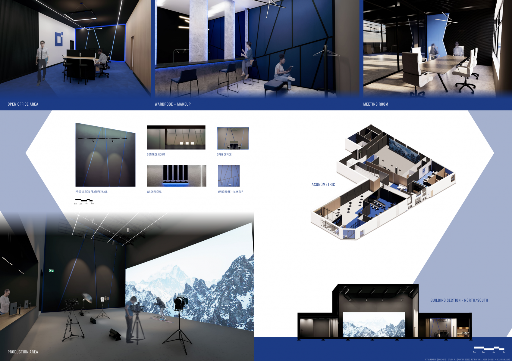 The academic project required students to develop designs for a hypothetical relocation of StudioLab xR to 200 Princess Avenue, which would double the operational footprint. Students investigated the specialized requirements of Visual Effects (VFX) production environments, editing suites, and Unreal Engine training facilities. This involved rigorous research, analysis, spatial programming, and design development to propose engaging and functional new environments.