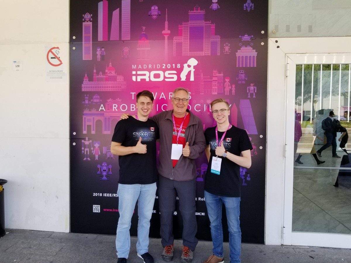 Representing the University of Manitoba at IROS 2018 from the Autonomous Agents lab were undergrads: Louis O’Connor, in Computer Science, and Vlad Samonin, in Computer Engineering. They did a tremendous amount of work, which was supervised by Dr. Meng Cheng Lau (Post-Doctoral Fellow), and Professor John Anderson.