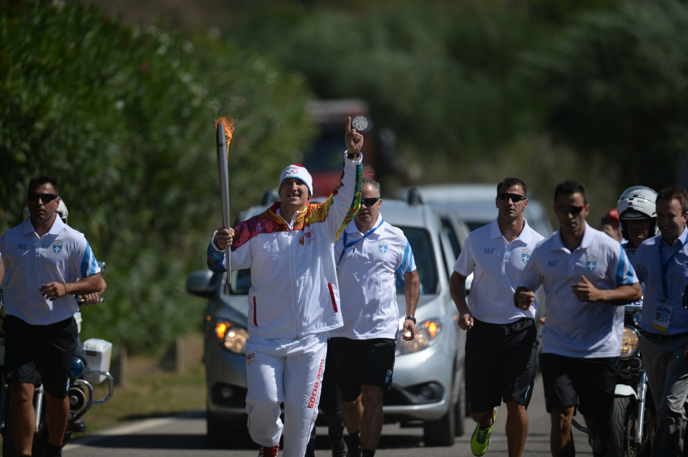 Hockey player Alexander Ovechkin carries the Olympic Torch in advance of the 2014 Winter Olympics in Sochi.