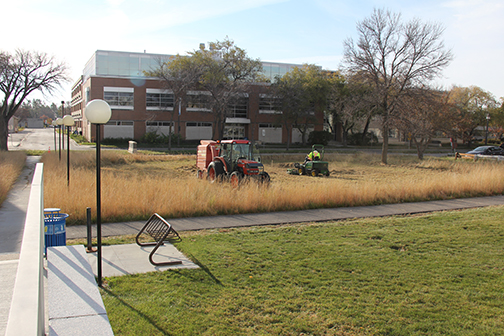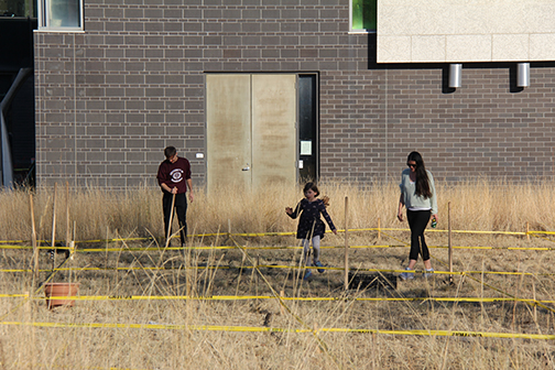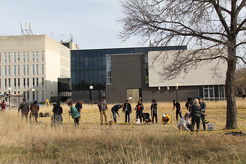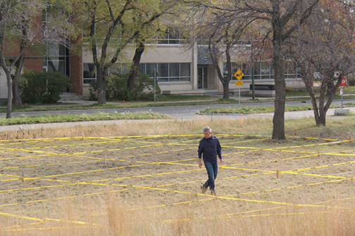 First, the 500 square metres circle was precisely mowed ‘into’ the tall grass prairie with support from Physical Plant. Then, the circle was divided into 48 sections with up to 12.5 square metres in size. Depending on the section size, 300 to 500 bulbs were planted per section. After a brief introduction to bulb planting, bulb spacing, bulb beds and soil coverage, everyone interested was invited to participate.