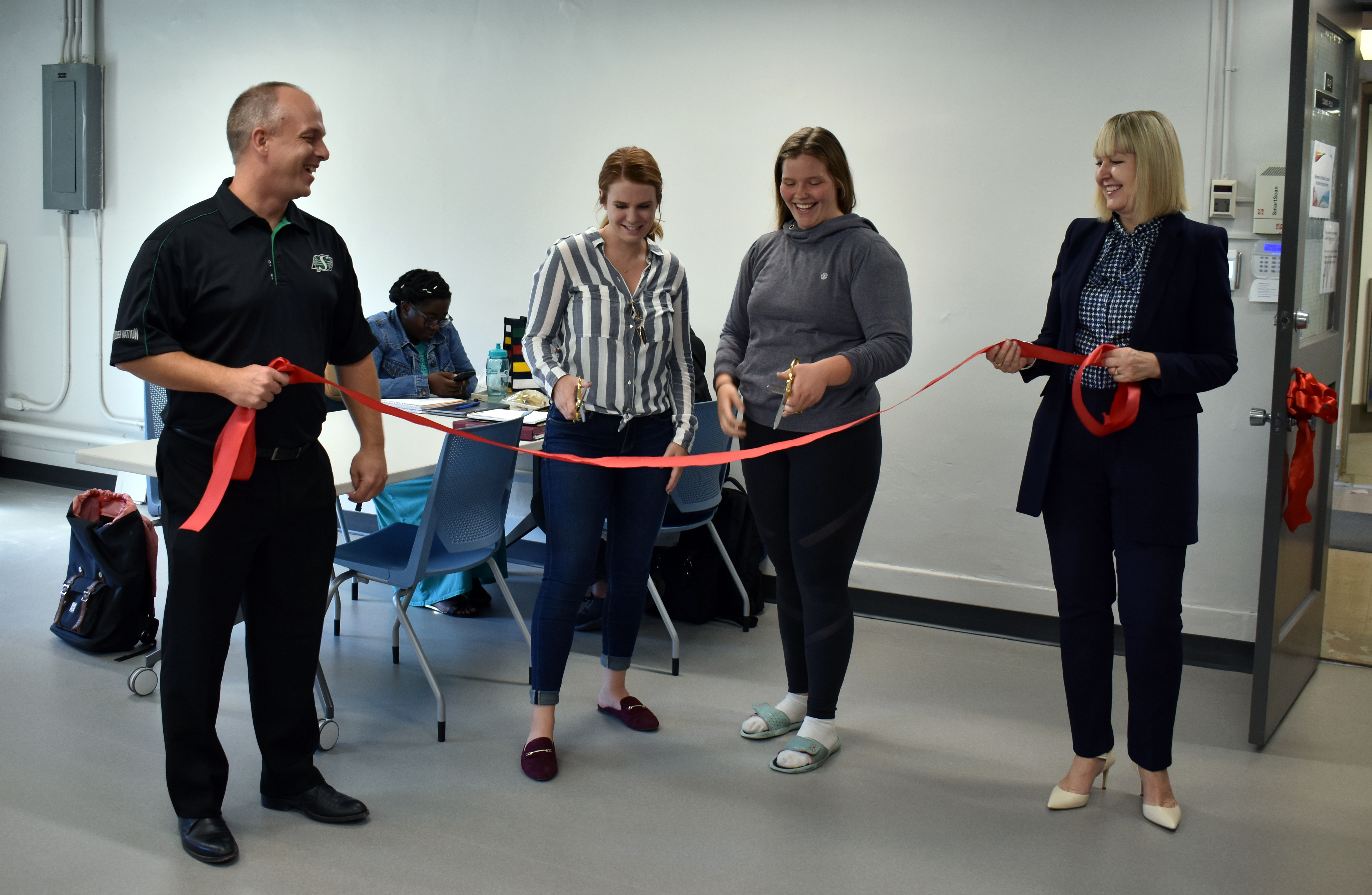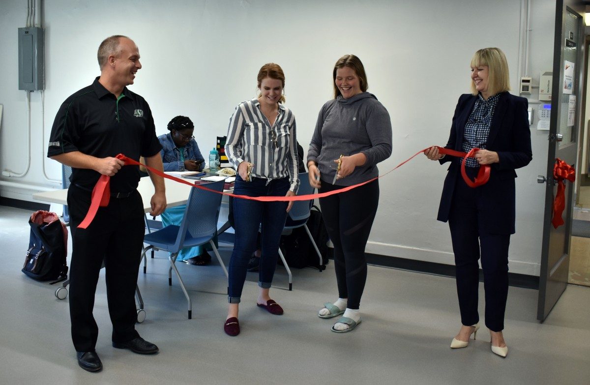 From left to right: Dr. Jared Carlberg, students Renee Taillieu and Julie Sprague, and Dr. Christine Ateah cut the ribbon on the refreshed student lounge