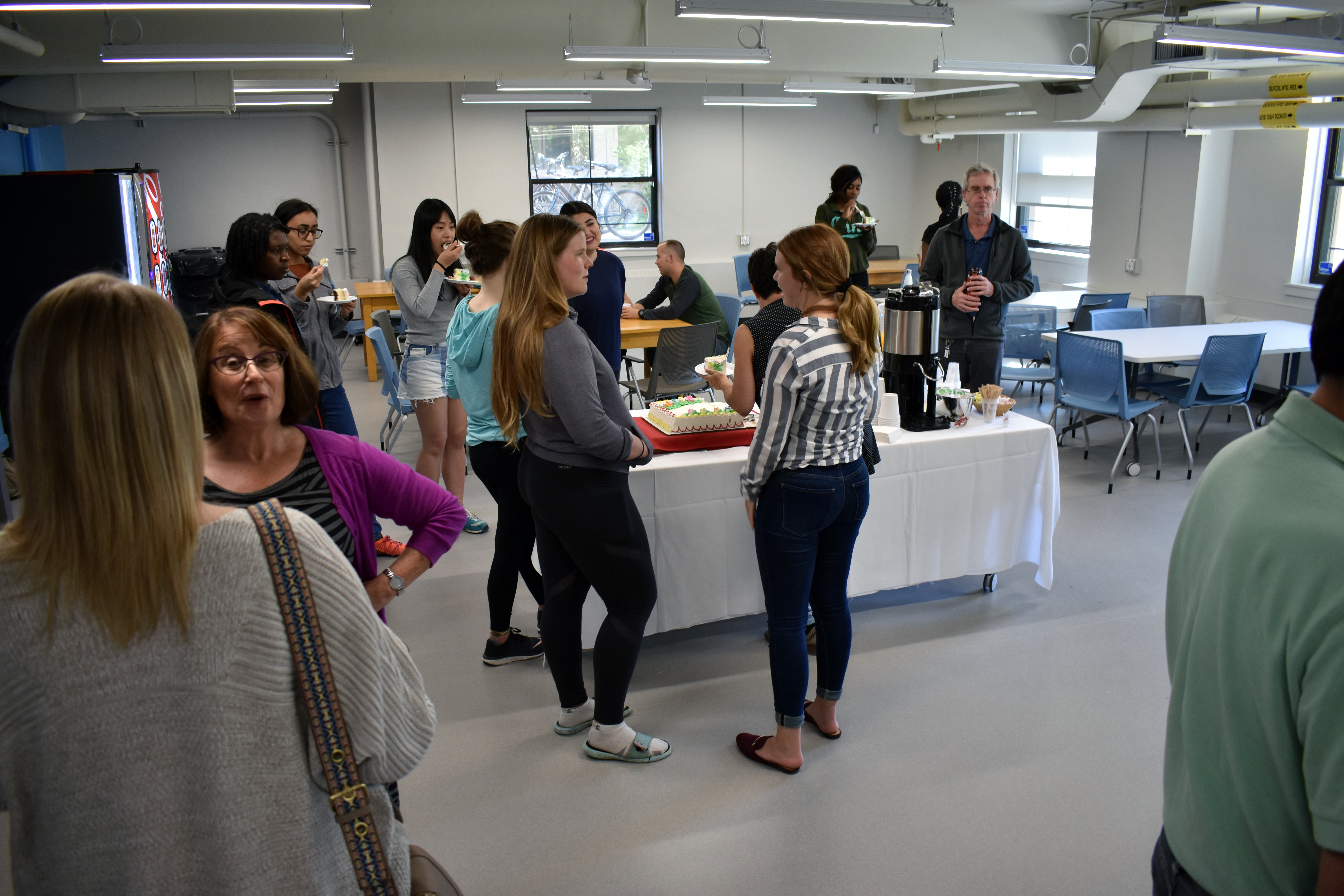 The brightly colored lounge includes modern lighting, tables and chairs for meetings and meals, amenities such as microwaves and charging stations, and a large monitor for presentations. Students from both departments continue to regularly utilize the space for studying, social events and relaxation.