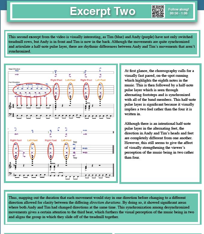 “An interesting relationship between the music and the band’s movement in this section is that the musical phrasing is seemingly uneven, but is hidden because of a displaced dance sequence between Tim and Andy,” Liu says.